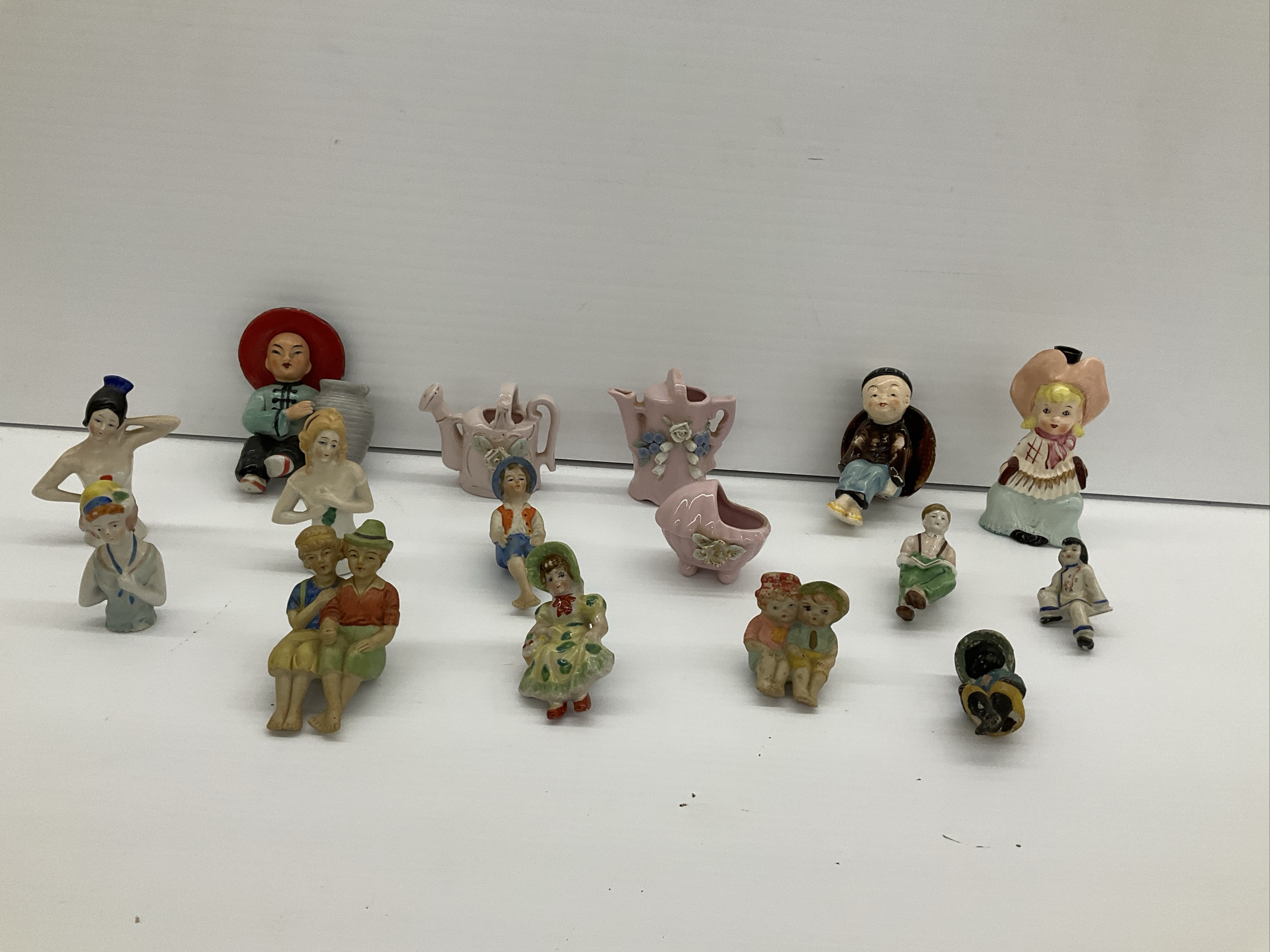 Lot of porcelain figurines, most of which appear to be marked 'Made in Occupied Japan'. Figurines vary in size and depict people, some pairs of people, and miniature pink planters/watering cans. Tallest 5 in.