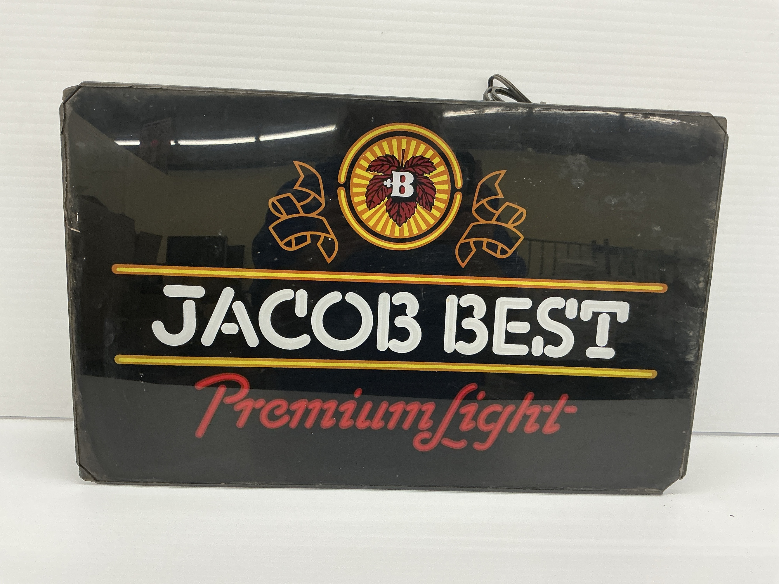Illuminated Jacob Best Premium Light beer advertising sign. Features the Jacob Best logo and 'Premium Light' text. The sign is black with a white and red design. Did not light, may need new bulb. See photos for condition. 13 x 21 x 4 in.