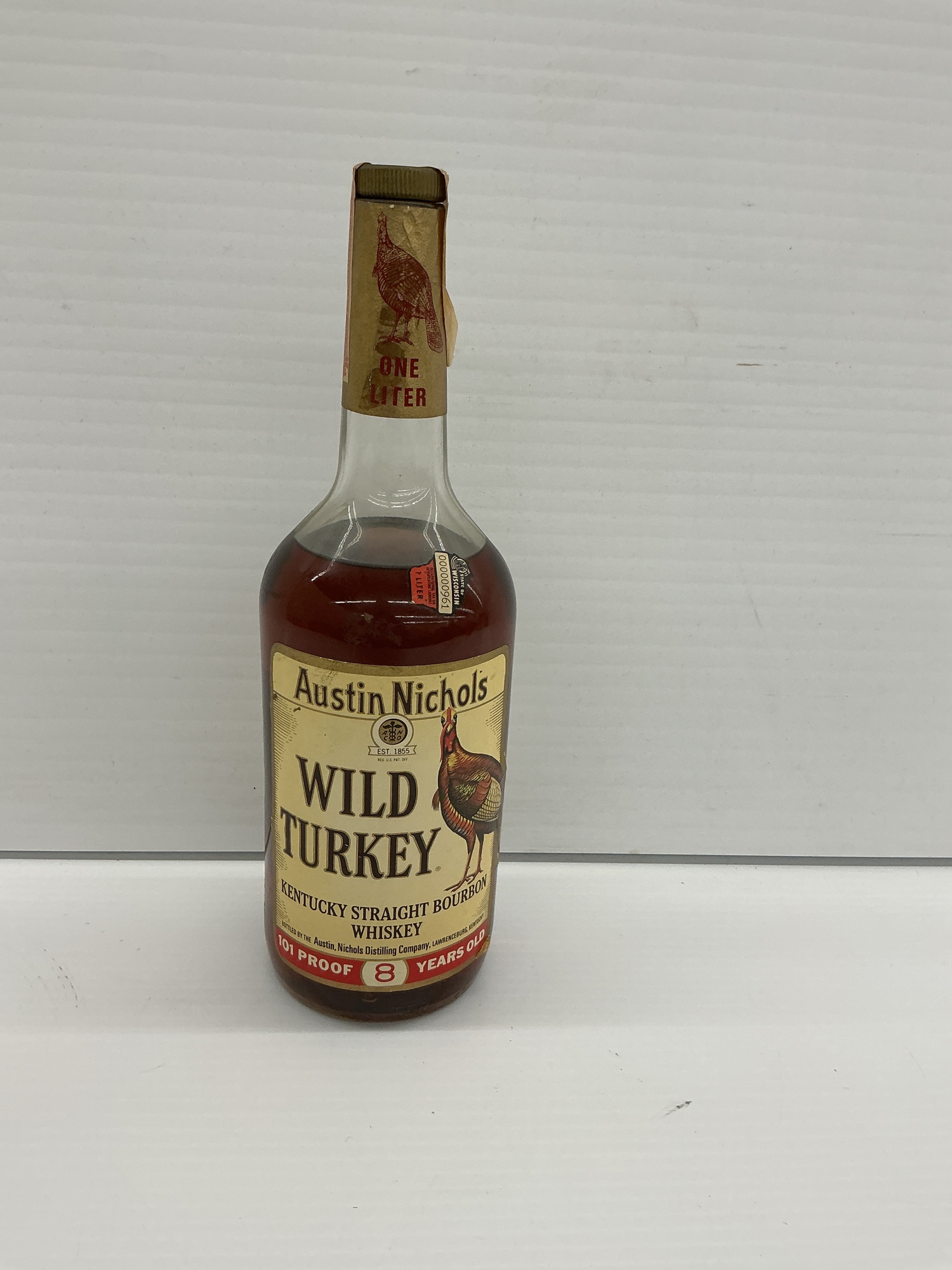 This is a vintage bottle of Austin Nichols Wild Turkey Kentucky Straight Bourbon Whiskey. It is 101 proof and 8 years old, bottled in one liter. NO SHIPPING, MUST BE 21 OR OLDER TO BID ON/PURCHASE.