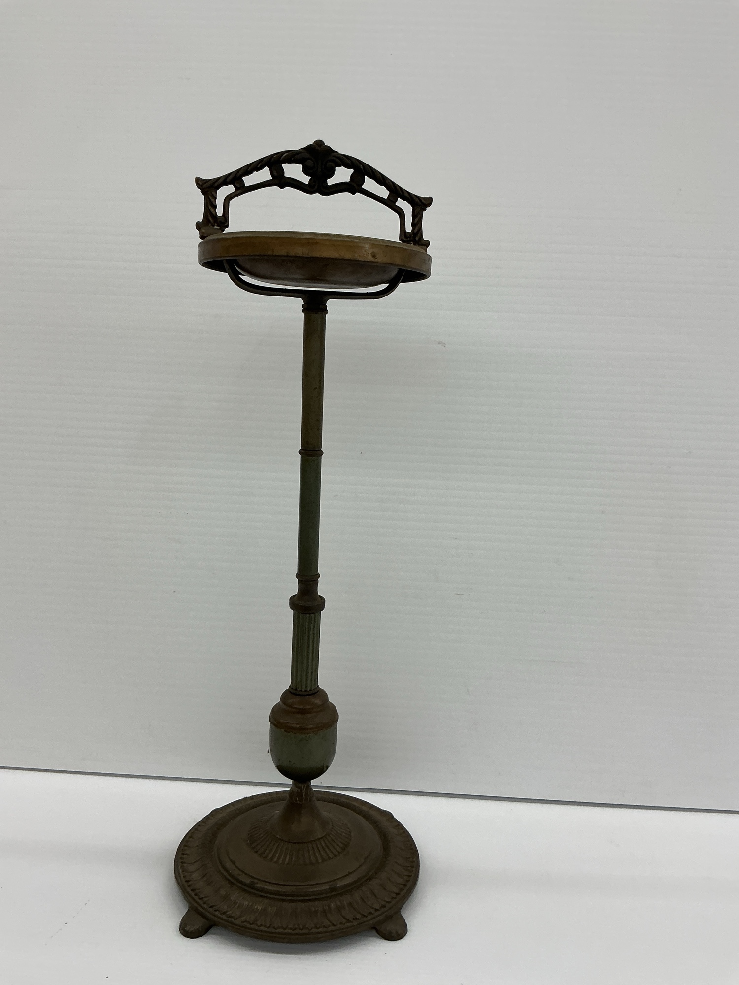 This is an Art Deco standing ashtray with a round tray and decorative support. It has a circular base with detailing. 26 in. tall