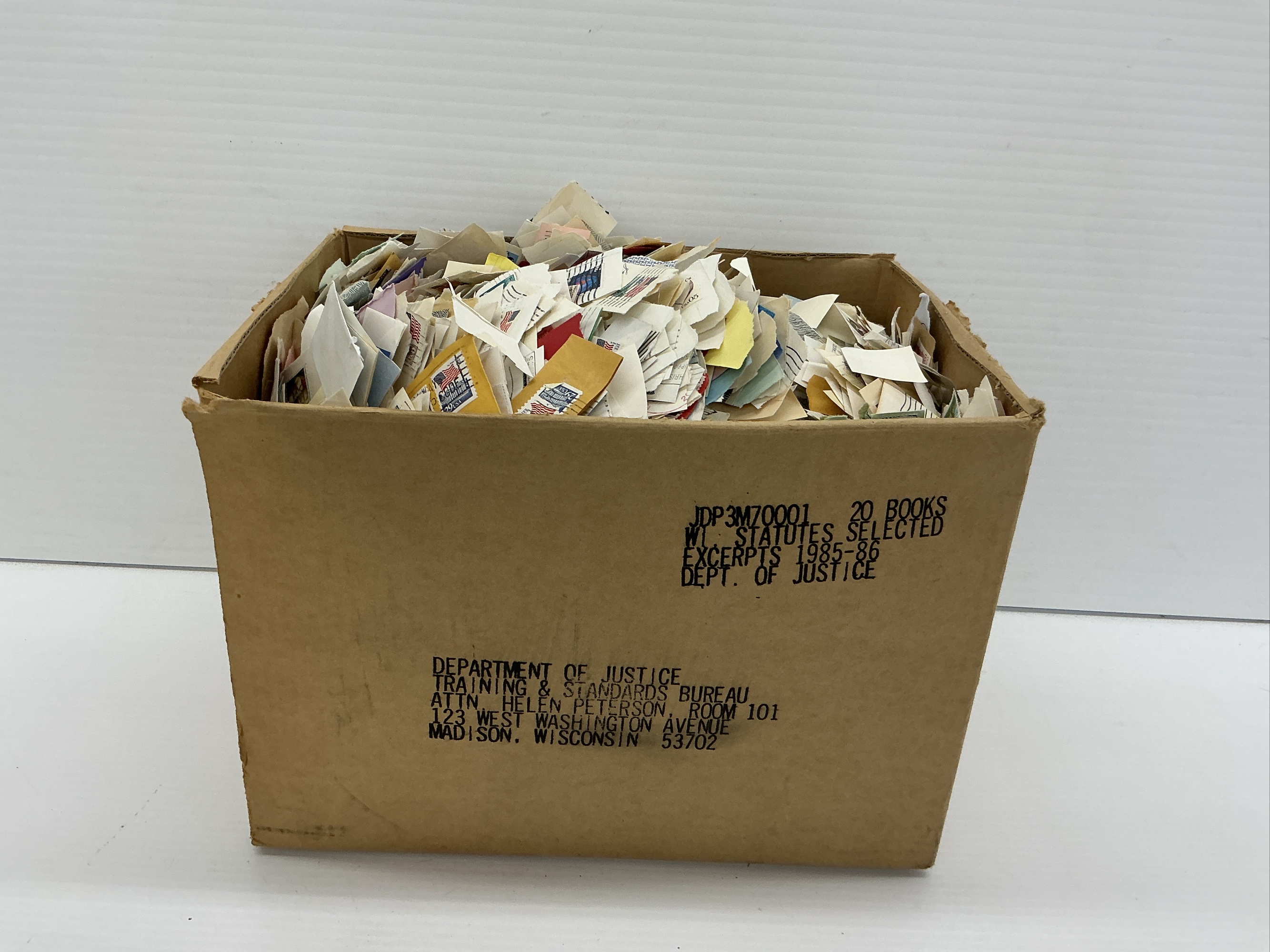 This lot features a large quantity of stamps, mostly US, contained within a cardboard box. The stamps vary in design and denomination. Box 6 x 14 x 11 in.