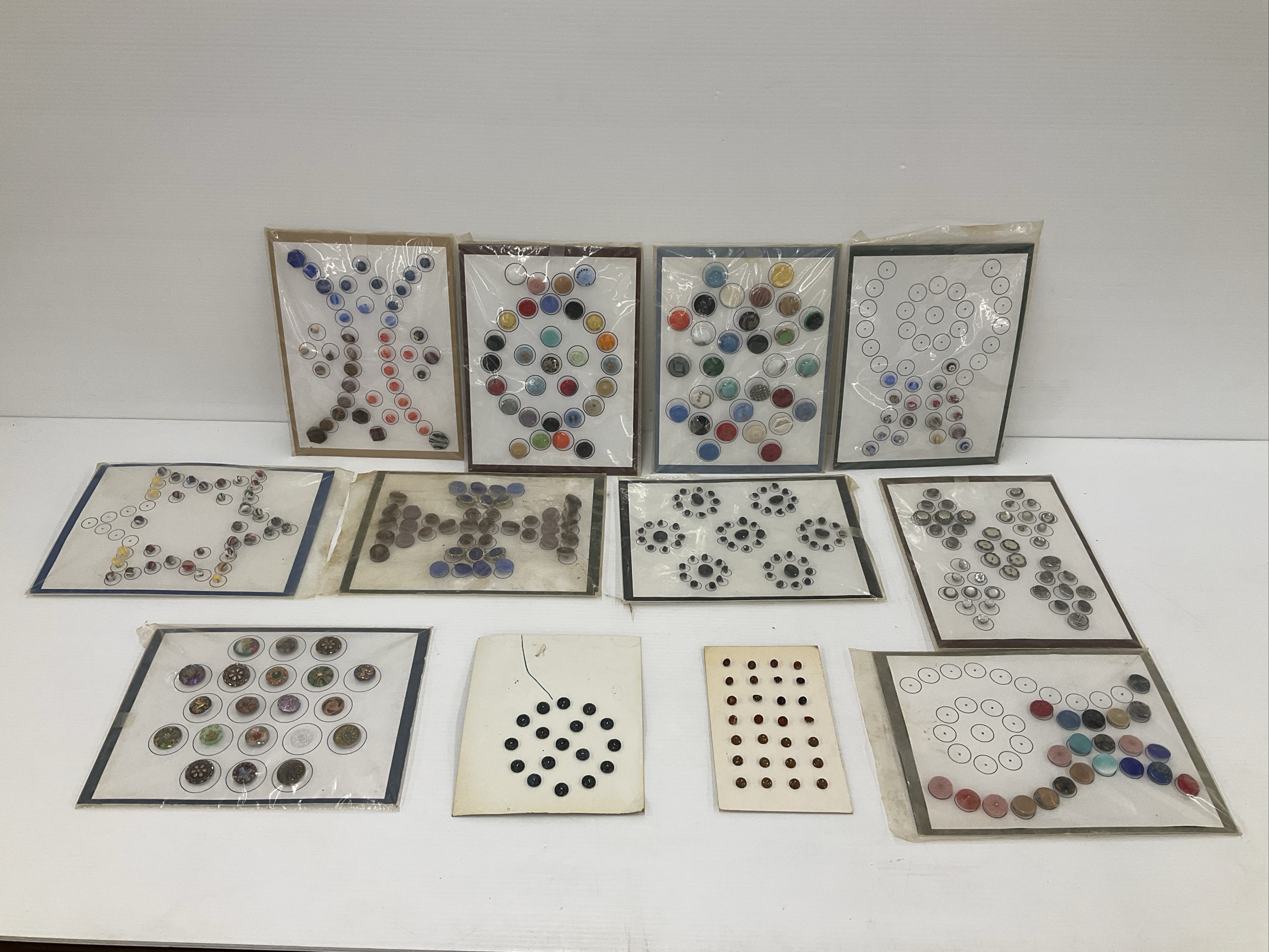 Collection of various buttons, some arranged in groups, others in rows. Each set is mounted on a card.