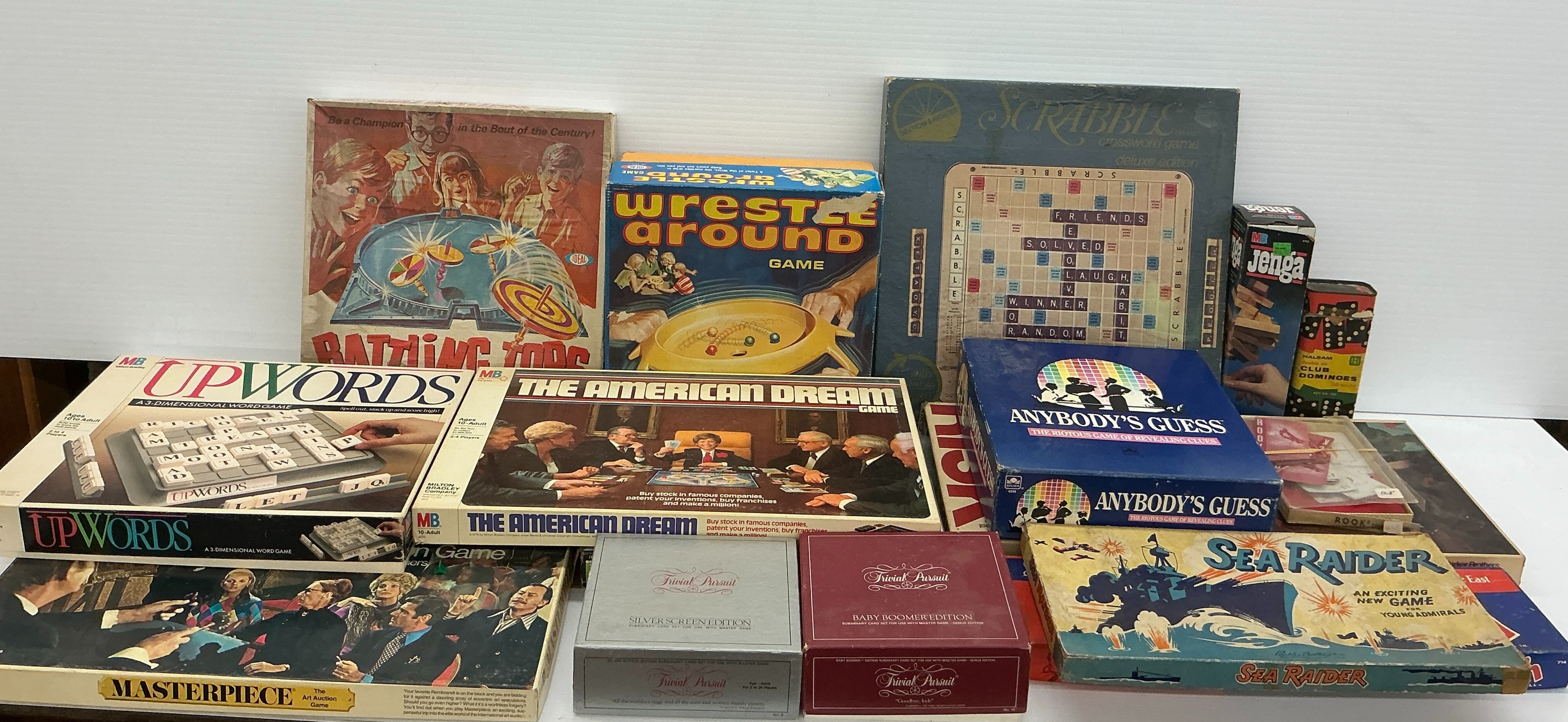 This mixed lot of board games includes popular titles like Scrabble Deluxe Edition, Risk, Trivial Pursuit, Jenga, Kalak, Battling Tops, Upwords, Masterpiece, vintage Sea Raider, The American Dream Game, Othello, Wrestle Around, Dominoes, Boykers, Anibody's Guess and more. May be missing pieces.