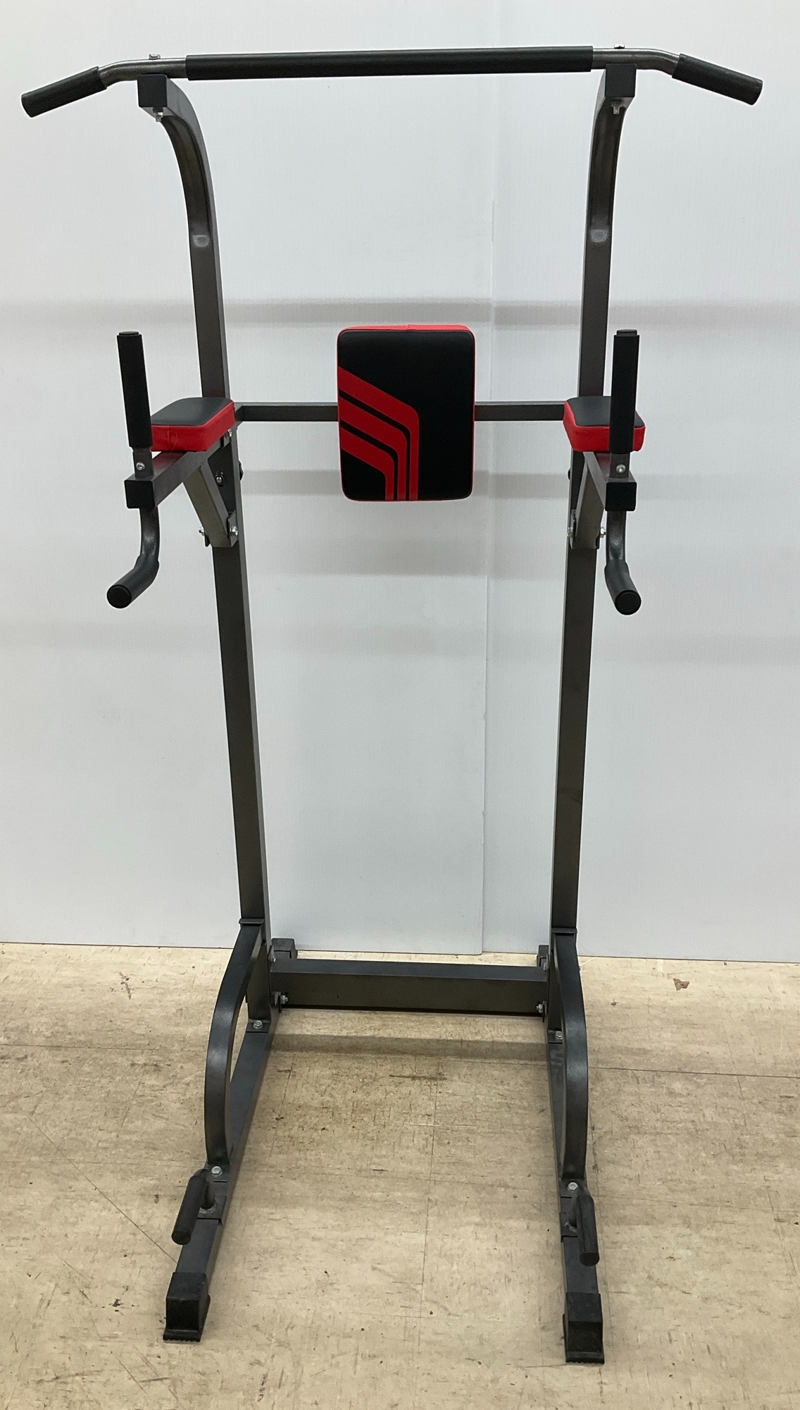 Home gym equipment, featuring a pull-up bar, dip station, and padded support for bodyweight exercises. 72 x 27 x 40 in.