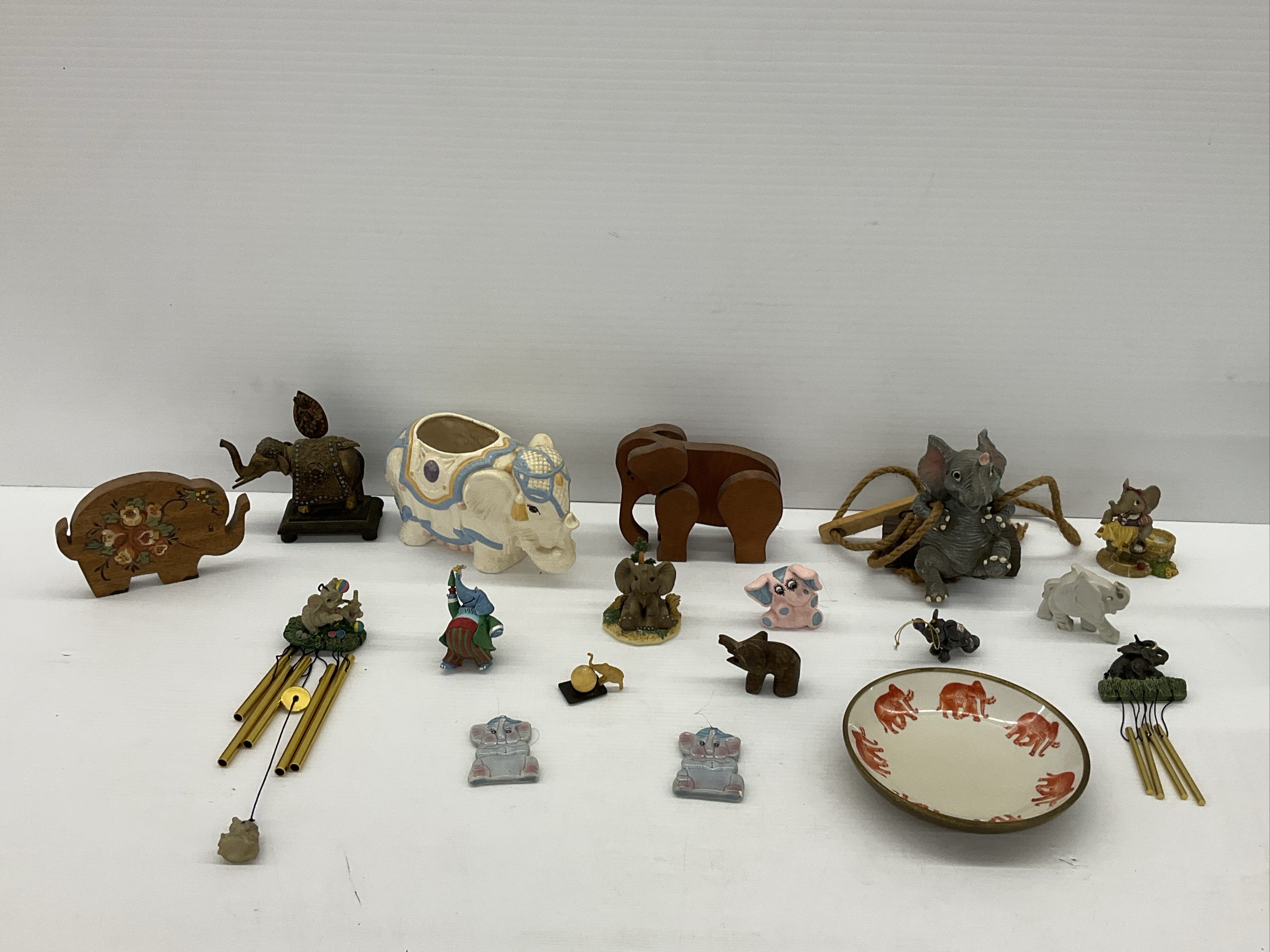 This collection features a variety of elephant-themed figurines and collectibles, including wooden figures, ceramic pieces, wind chimes, a Cast Art Industries Dreamsicles 'Elephant Tales' Snow White Figurine and more. Great for any elephant lover! Tallest 7 in.