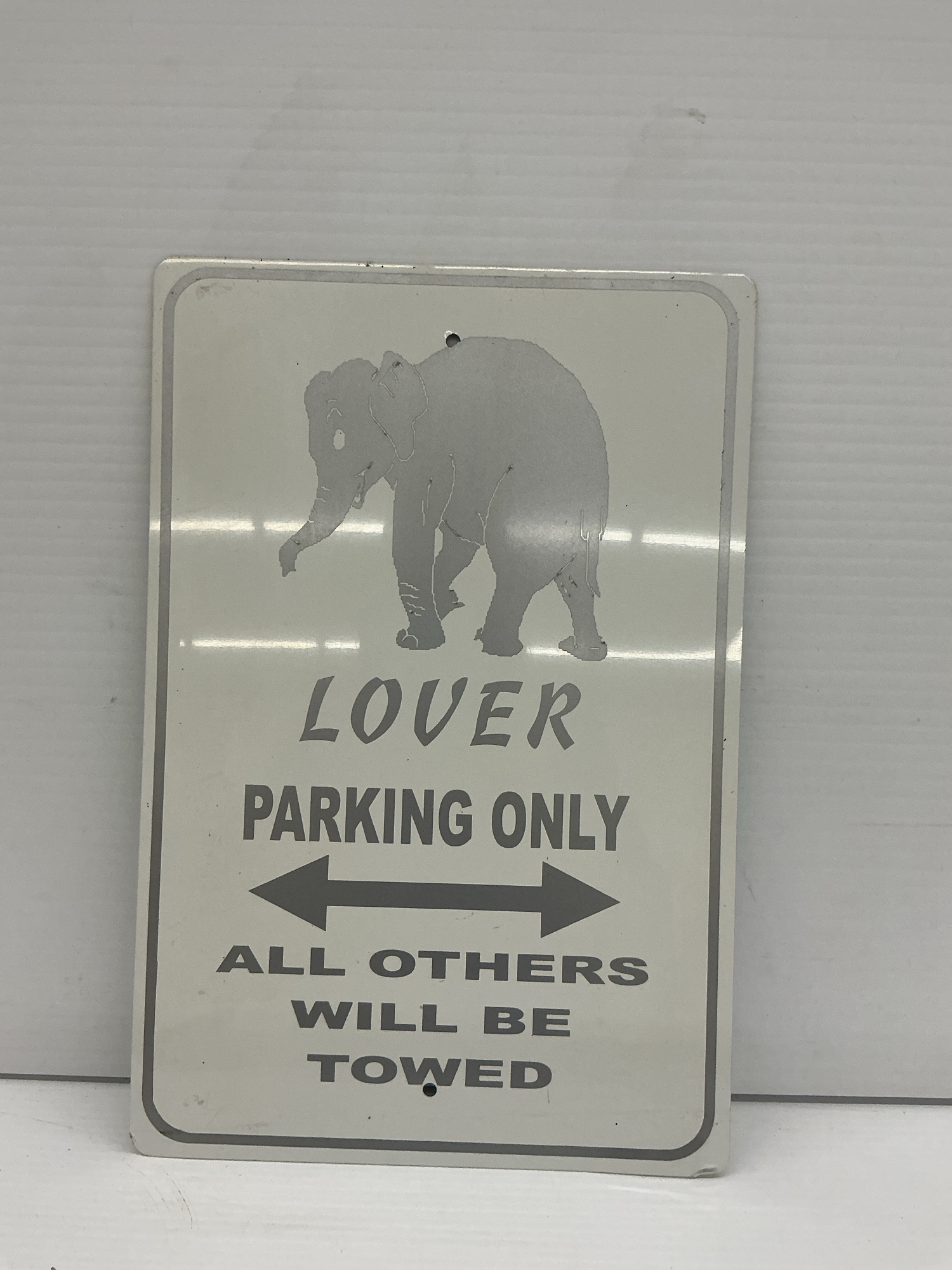 Novelty metal parking sign featuring an elephant with 'Lover Parking Only' printed on it. 18 x 12 in.