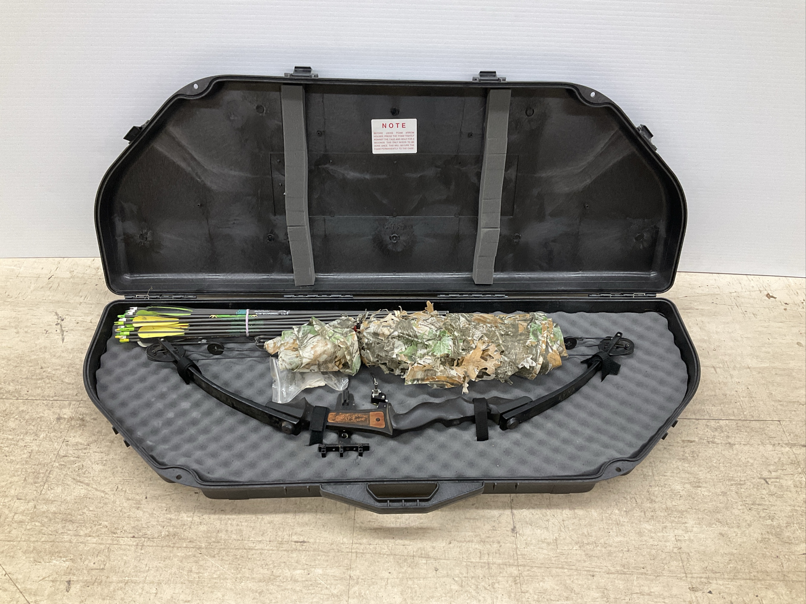Martin Lynx Compound Bow. Comes with arrows, camo cover and accessories in hard case. See photos for details.