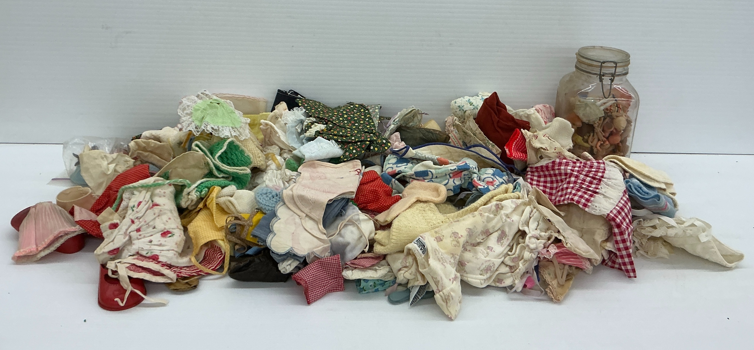 Jar of Vintage Small Dolls & Doll Parts and Large Lot of Doll Clothes