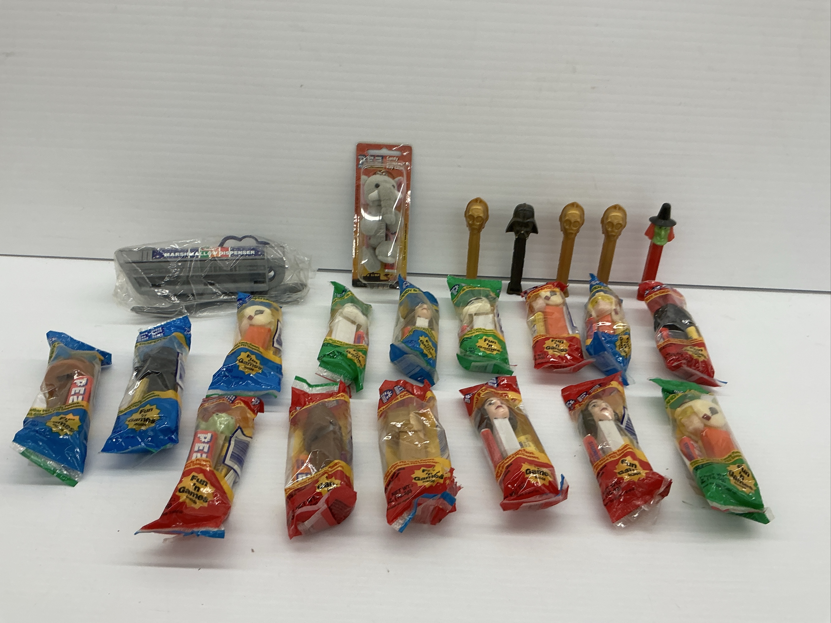 This lot includes a variety of PEZ candy dispensers. You'll find Star Wars characters, Princess Leia, a wizard, and even an elephant dispenser, as well as a Kraft marshmallow dispenser. Great for collectors!