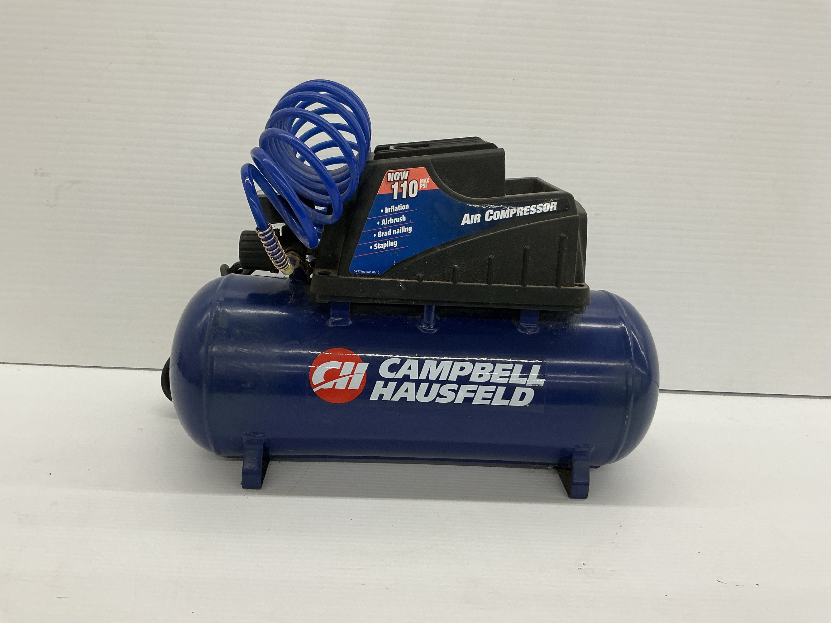 Campbell Hausfeld air compressor model FP209402. It is a 3-gallon compressor with a maximum of 110 PSI. It can be used for inflation, airbrushing, brad nailing, and stapling.