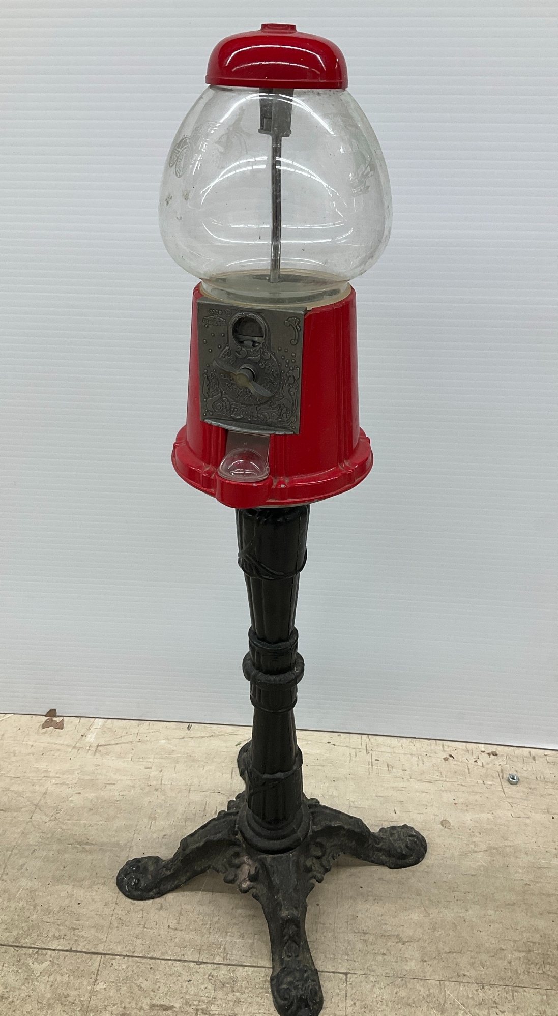 A Carousel branded gumball machine from 1985. The machine is red with a metal coin-operated front panel, and has a glass globe on top. It stands on a decorative black metal stand. 40 in. tall