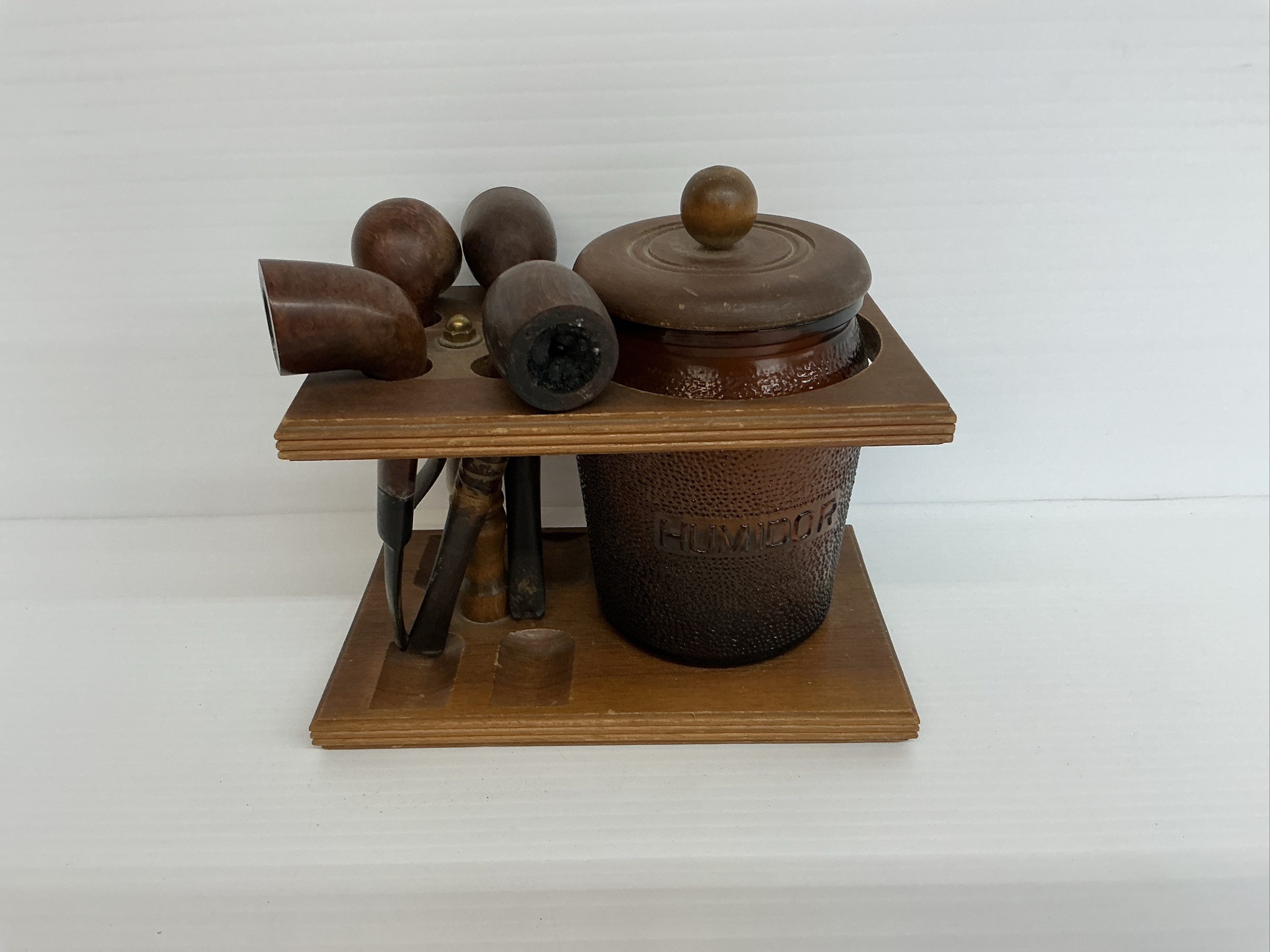 This lot includes several tobacco pipes of varying shapes and sizes. Also included is a wooden holder and brown glass humidor labeled 'Humidor' with a lid. 7.5 x 8.5 x 5.5 in.