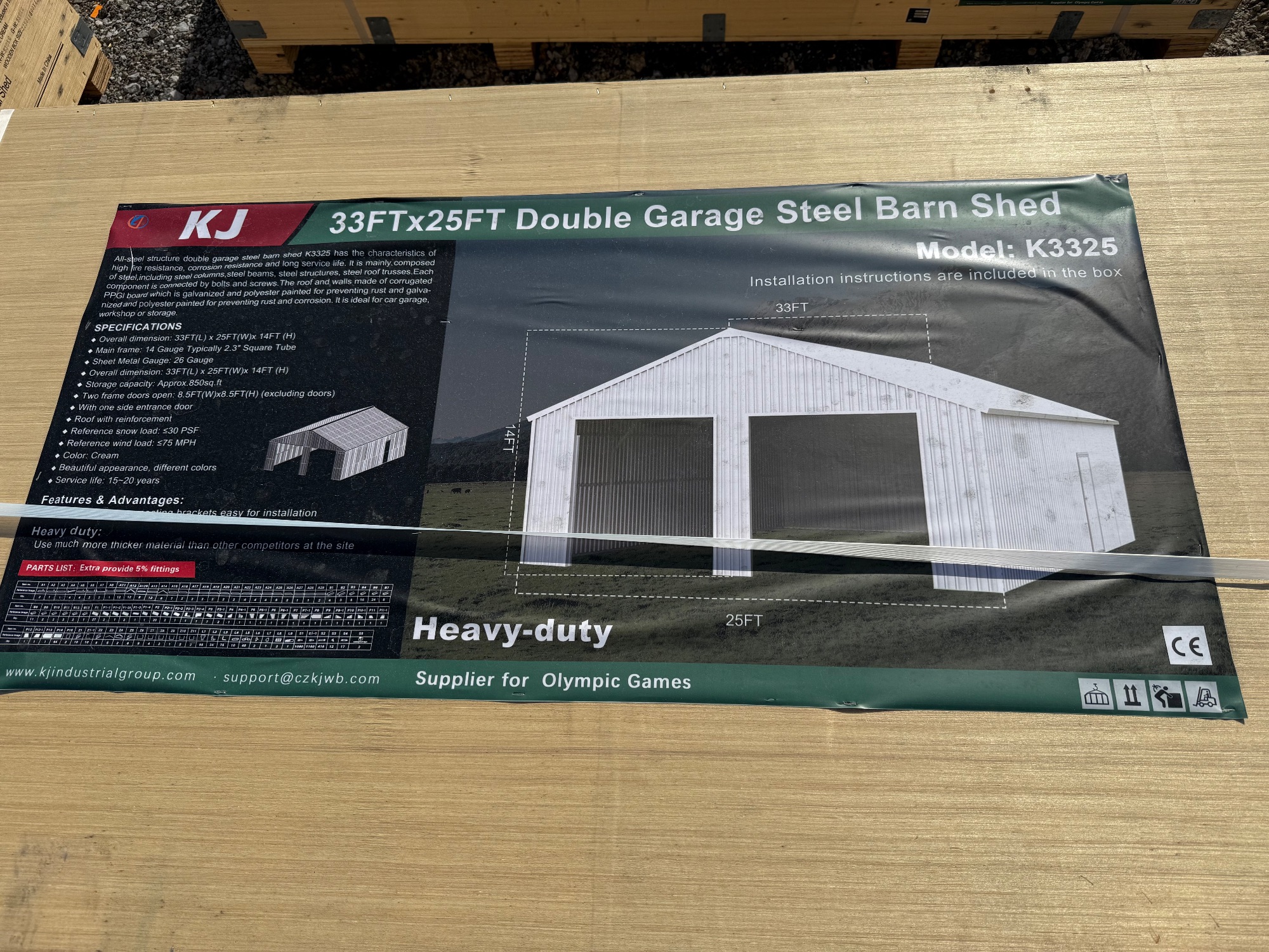2025 KJ Unused K3325 33ft x 25ft Double Garage Steel Barn Shed, SN# KJ25015699