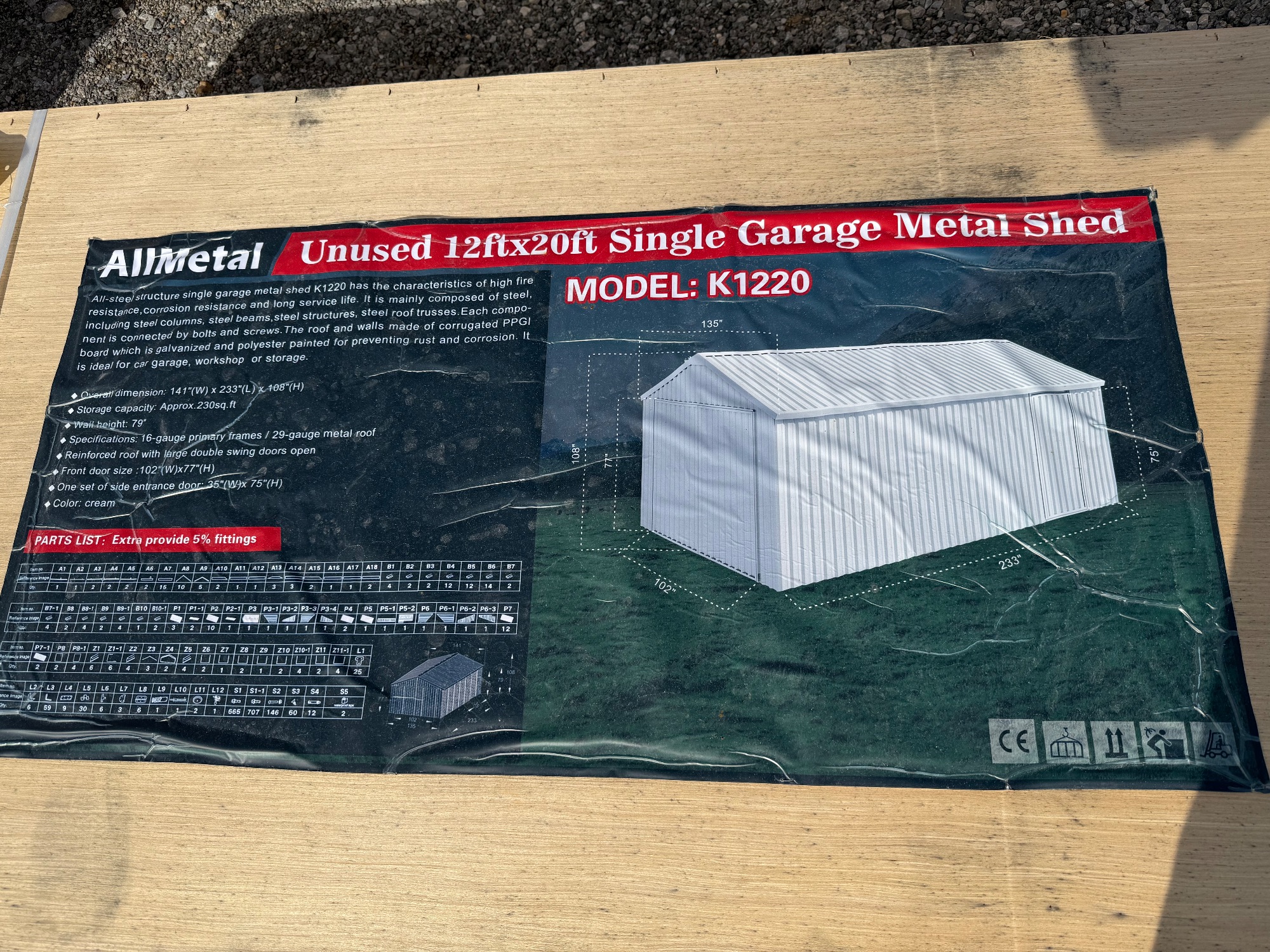 2025 AllMetal Unused K1220 12ft x 20ft Single Garage Metal Shed, SN# AM2502815