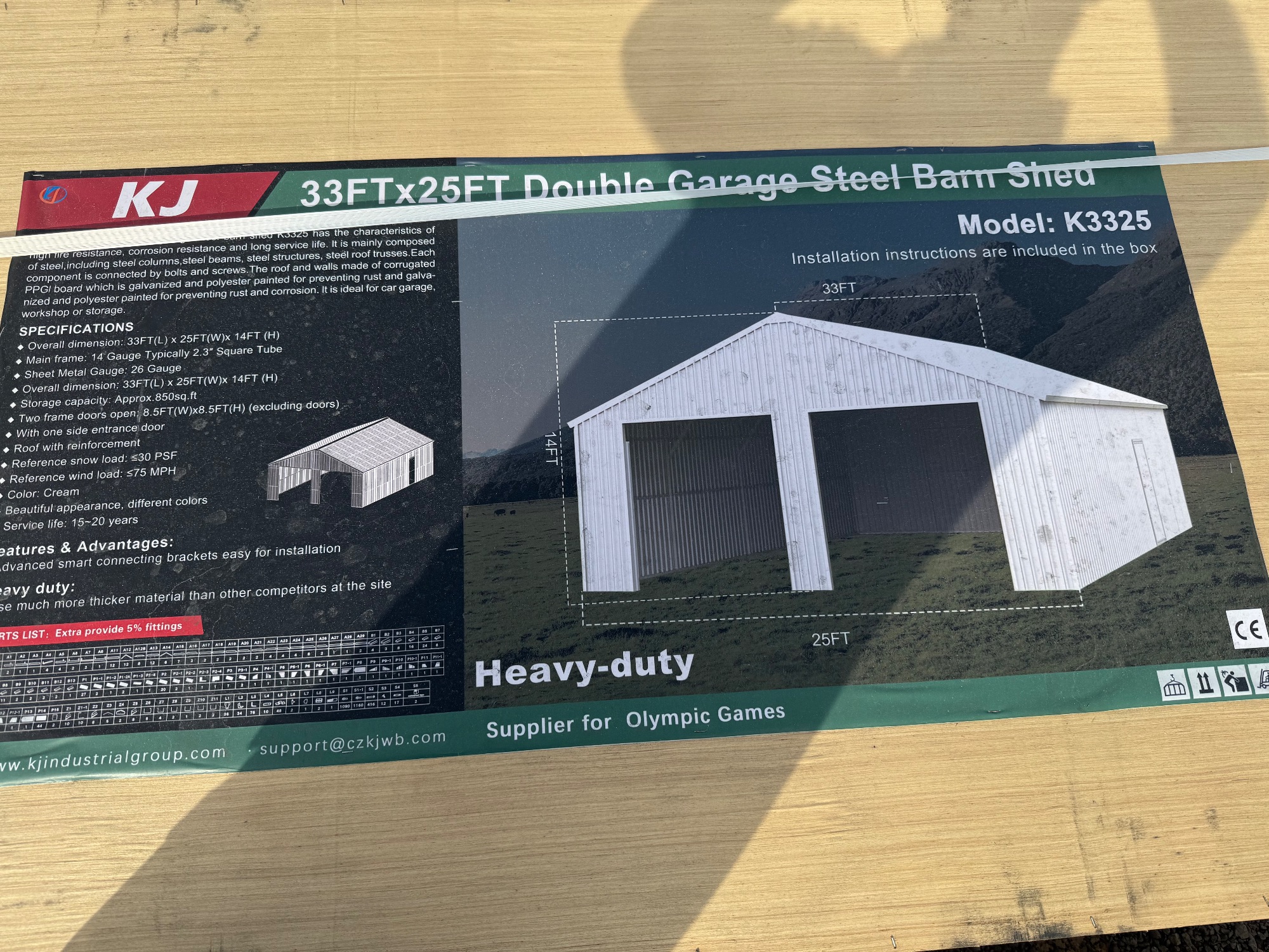 2025 KJ Unused K3325 33ft x 25ft Double Garage Steel Barn Shed, SN# KJ25015736