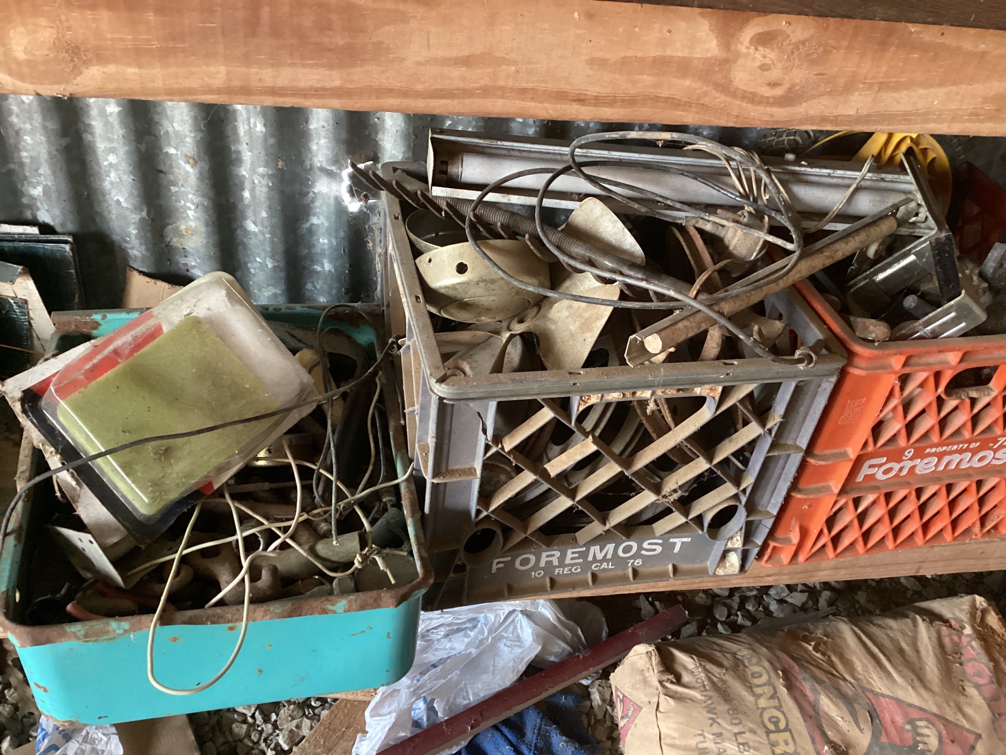 Collection of assorted metal parts, electrical components. Includes items stored in three different color crates, including a few fan blades and wiring.