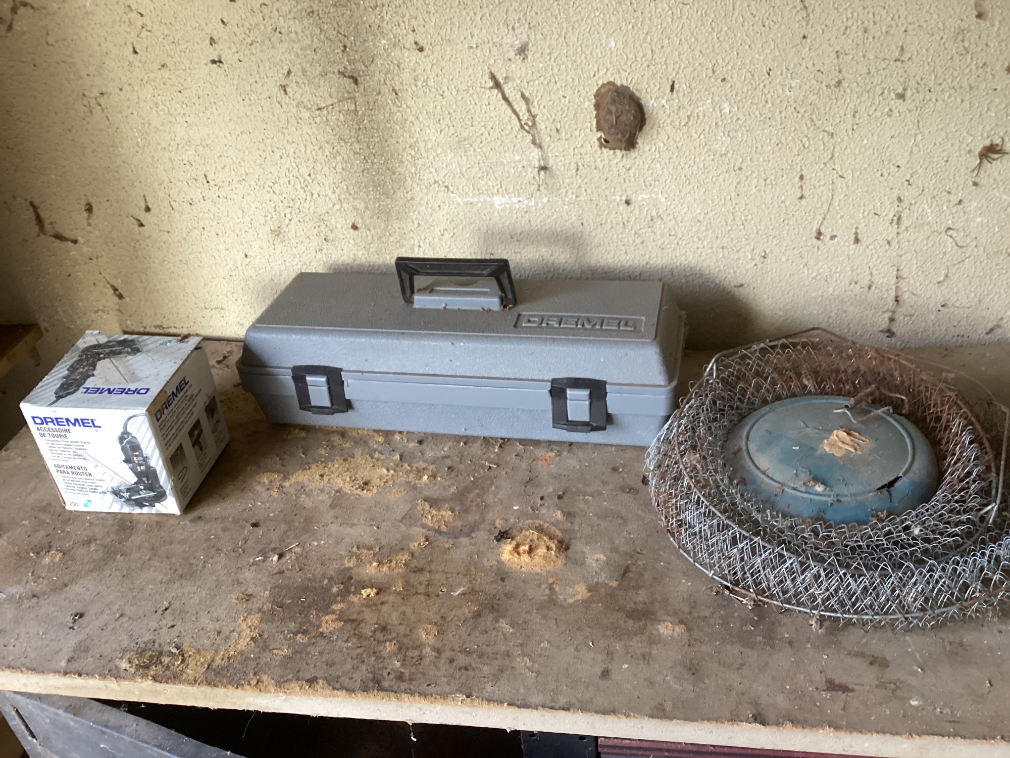 Dremel rotary tool set with accessories and case. Includes a variety of bits, attachments, and the rotary tool itself.