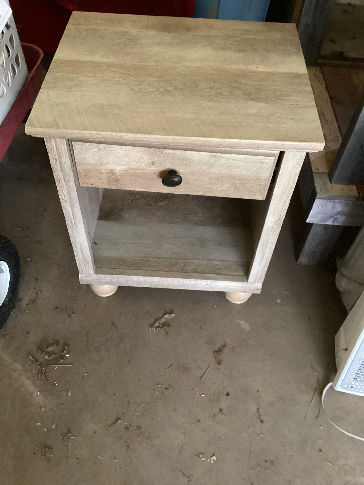 This is a wooden side table featuring a drawer and lower shelf. The table has round feet.