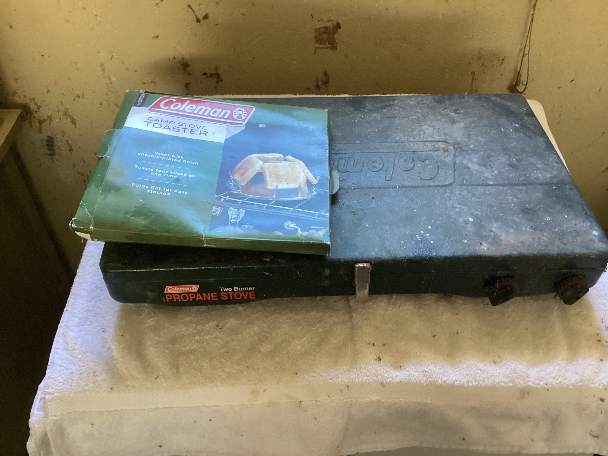 Includes a Coleman two burner propane stove and a stove top toaster attachment that can toast 4 slices at once. The toaster is steel with chrome plated finish and folds flat for easy storage.