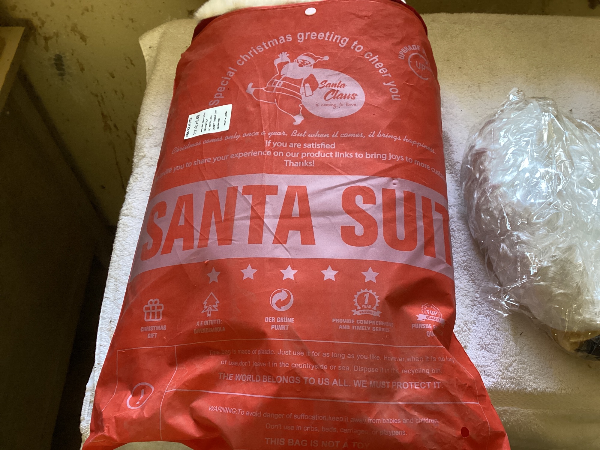 This lot includes a Santa suit and accessories, including a beard and possibly other costume elements. The suit is contained in a storage bag.