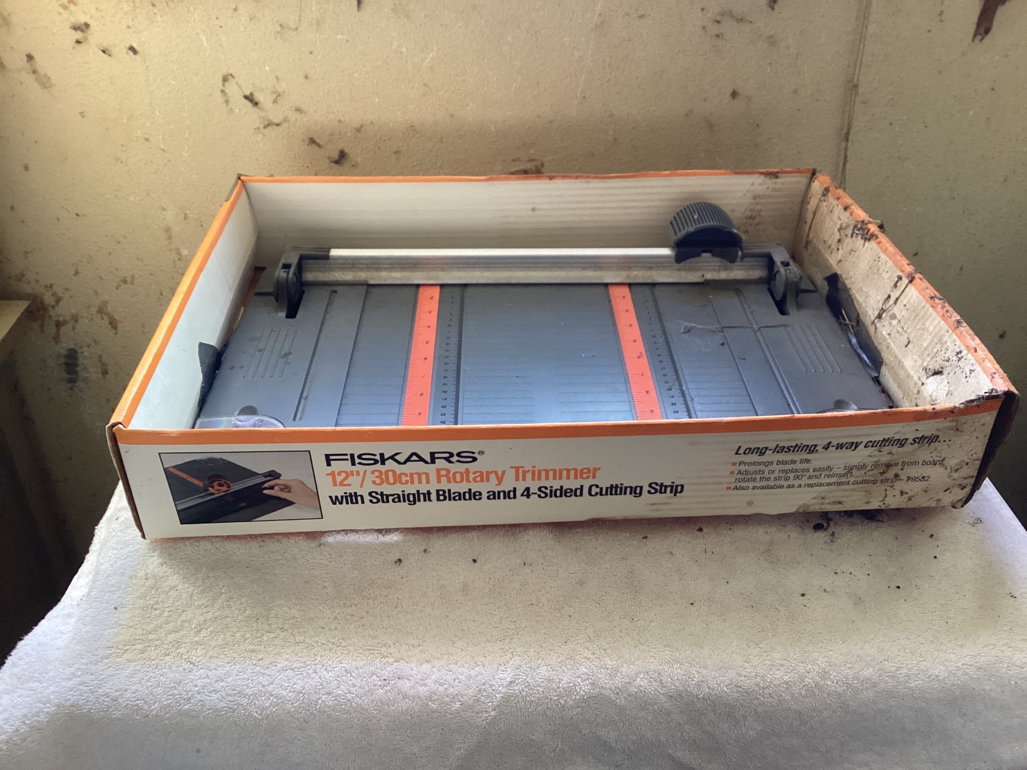 Fiskars 12" / 30cm Rotary Trimmer with Straight Blade and 4-Sided Cutting Strip. Long-lasting and easy to use, this trimmer makes cutting paper or other materials a breeze.