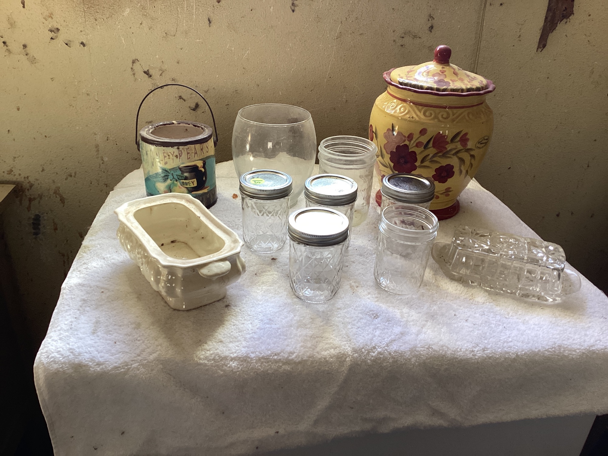 Collection of assorted glassware including canning jars, a stemmed glass, a honey pear paint can, a cut glass butter dish, a hand painted cookie jar, and a small ceramic planter.