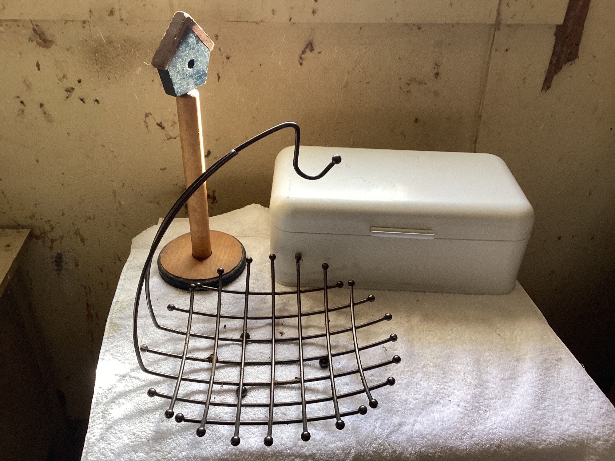 This lot features a metal trivet or fruit basket, a decorative wooden birdhouse on a stand, and a white plastic storage container. The container has a hinged lid.