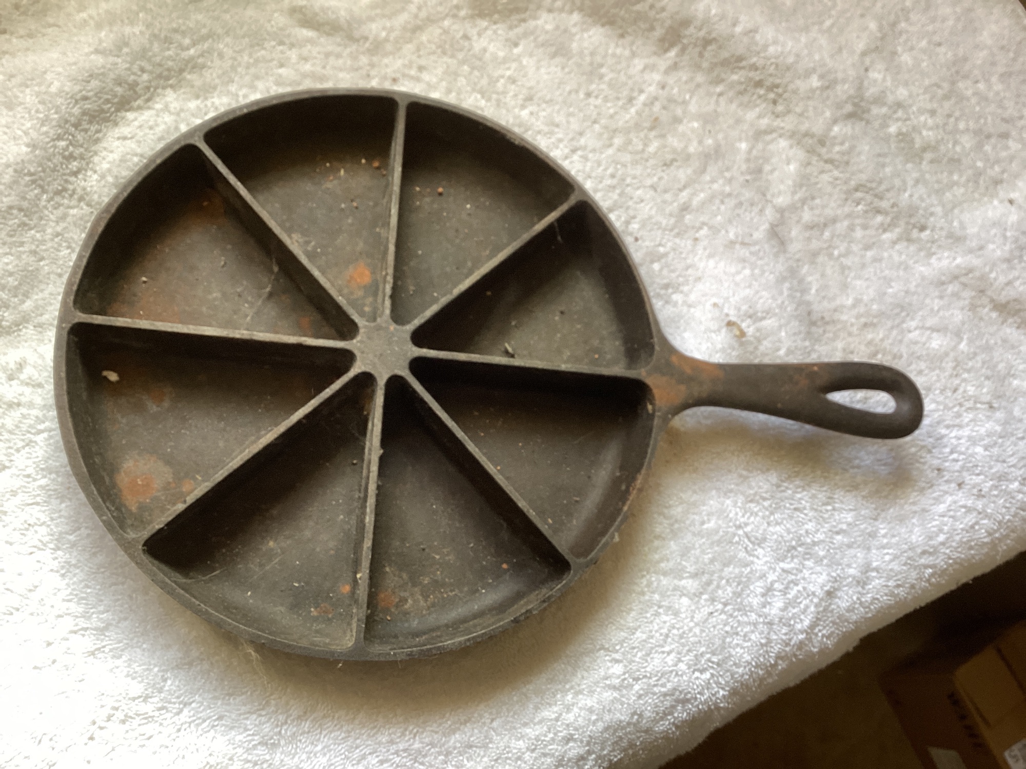 Cast iron cornbread skillet featuring wedge-shaped sections. Made in USA.