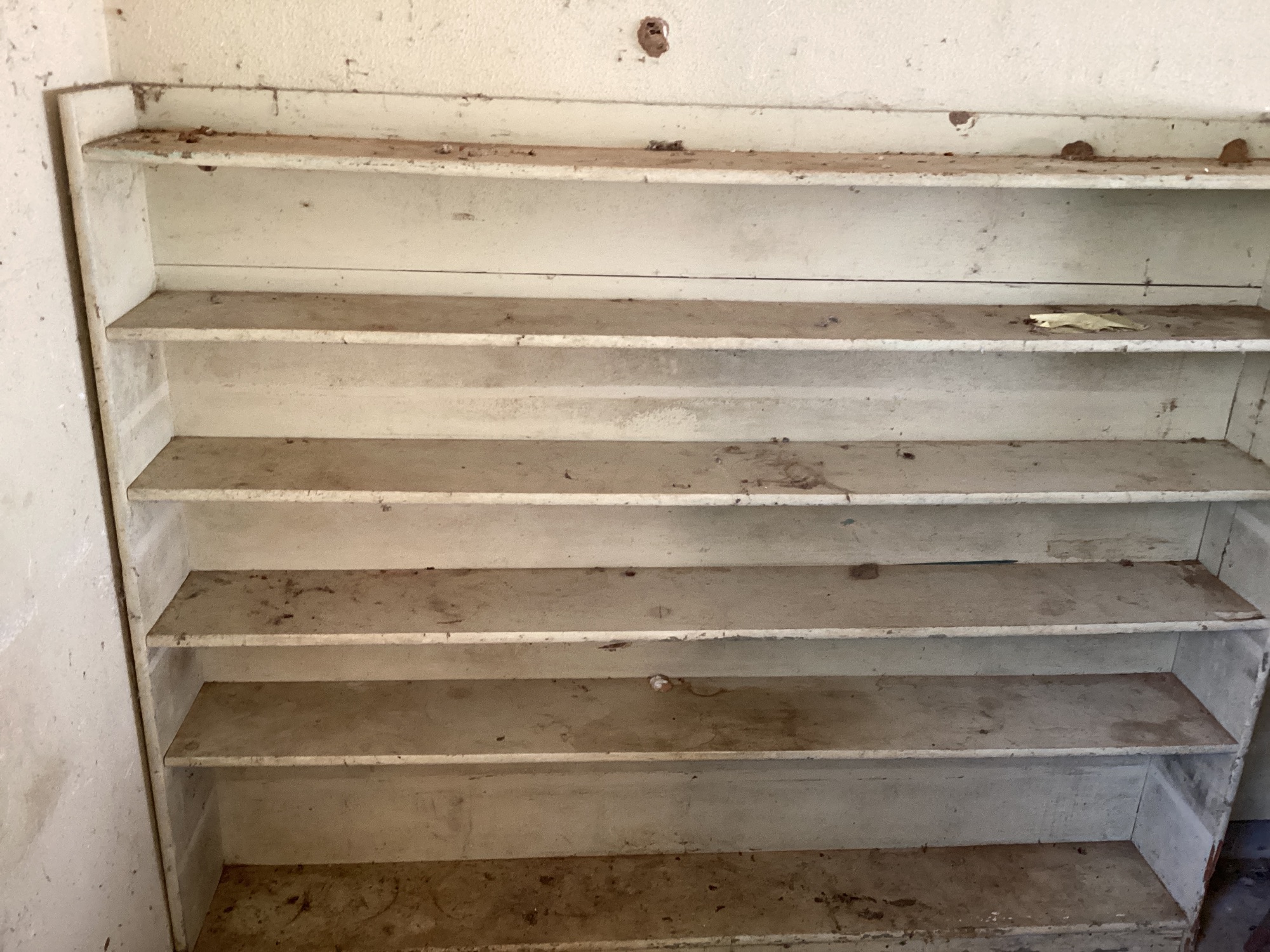 Large freestanding wooden storage shelf with multiple shelves. Shelf measures approximately 73.5" long, 9.5" wide, and 60" high.