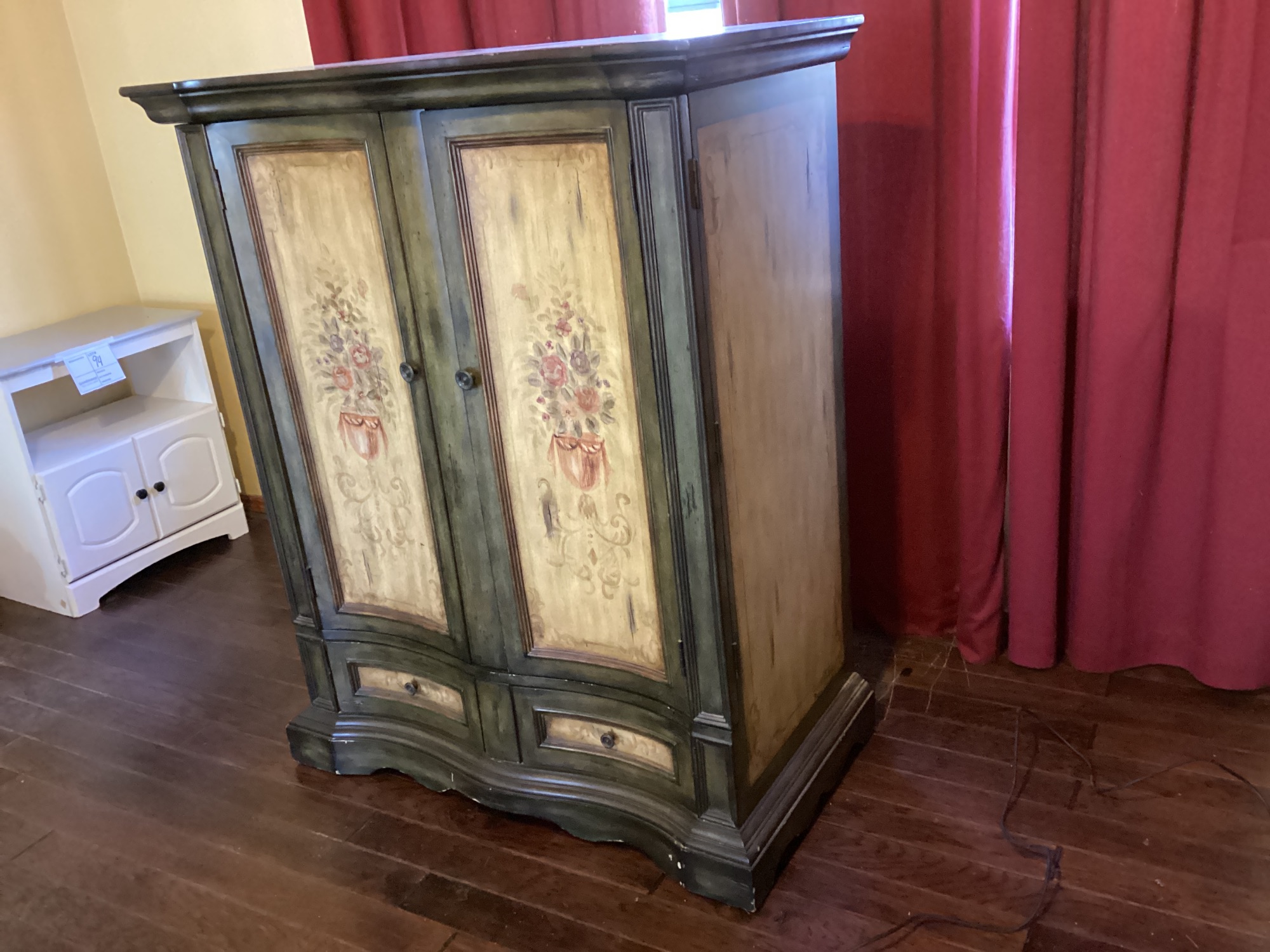 Two-door cabinet with painted flower design, two drawers at the bottom, and interior shelving. The cabinet measures approximately 44" wide, 23.5" deep, and 54.5" high.