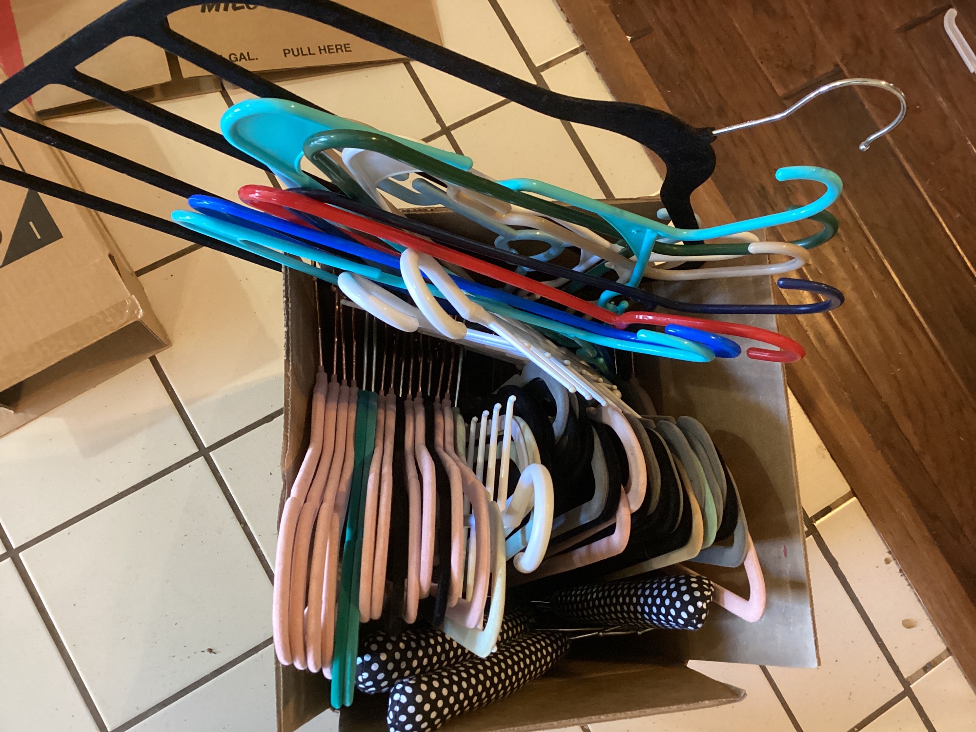 This lot includes a variety of clothing hangers in different styles and colors. Includes plastic, felt and fabric-covered hangers.