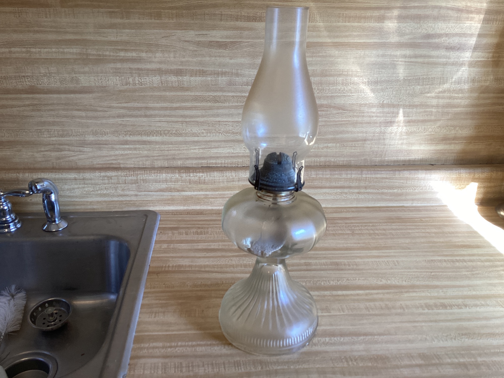 Clear glass oil lamp with attached glass chimney. The lamp has a bulbous middle and a base with vertical ribbing.