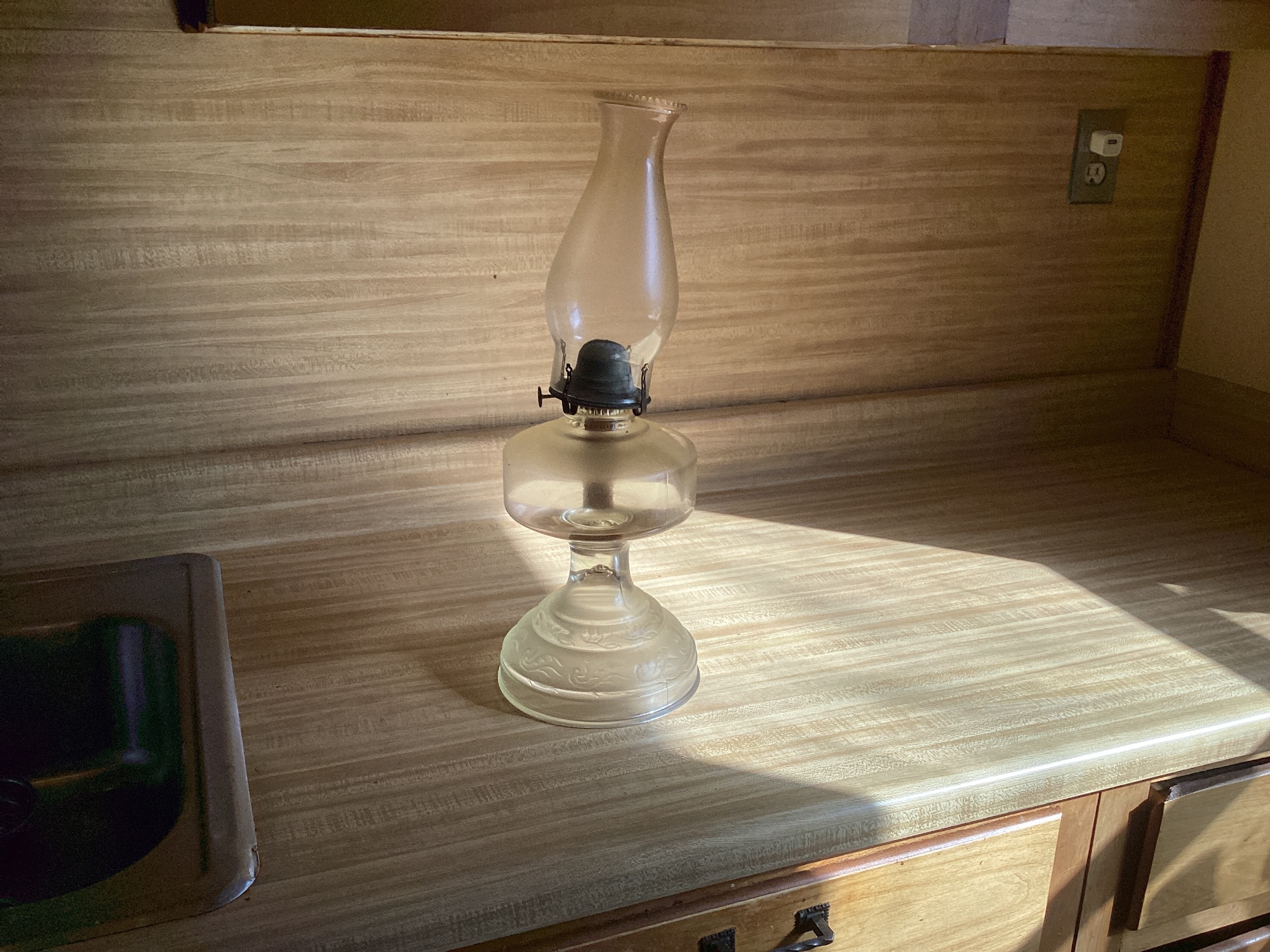 This is a clear glass oil lamp with a tall chimney. The lamp features a decorative pattern on the base.