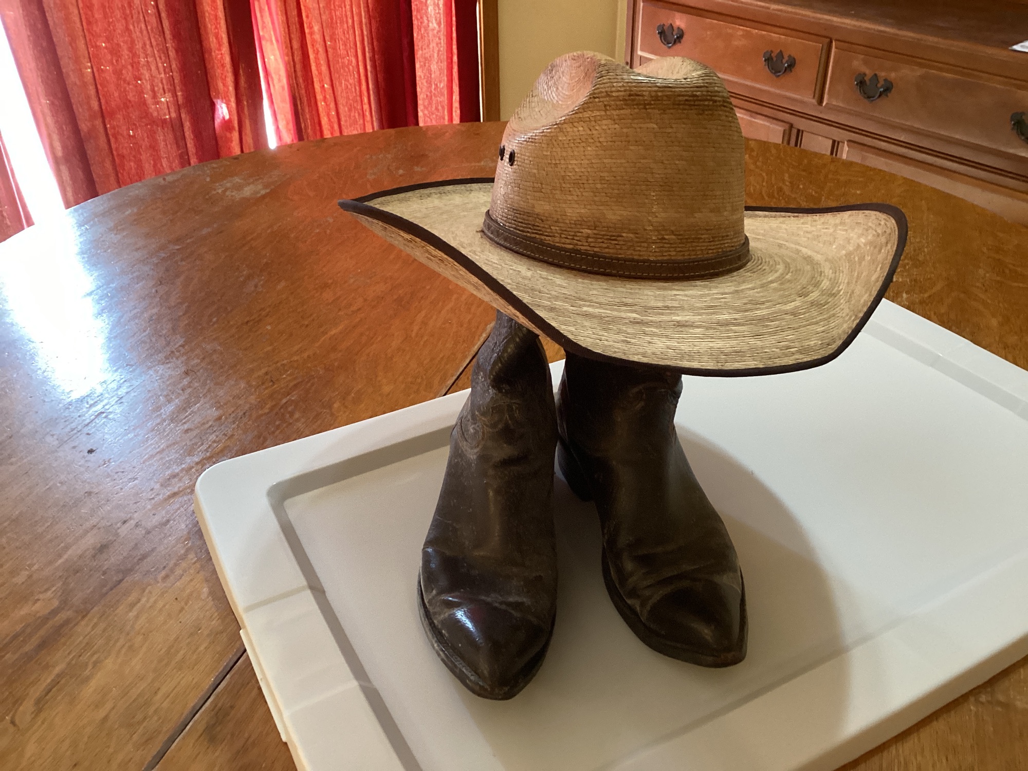 Set of cowboy boots and a straw hat. The hat is an Atwood and marked as size 7.