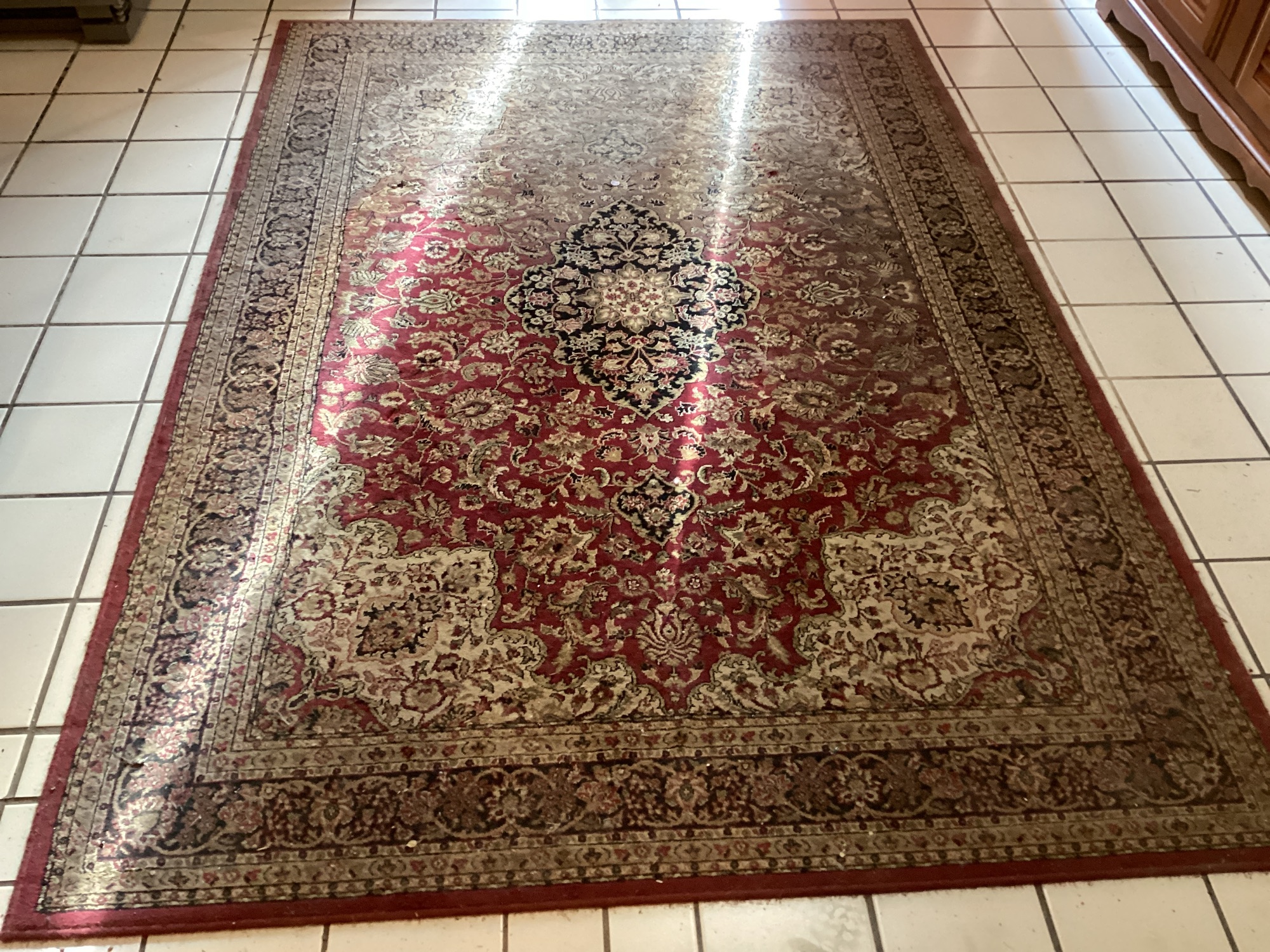 This is a large area rug. It features a traditional floral pattern in reds, creams, and blacks. It would make a lovely addition to your home.
