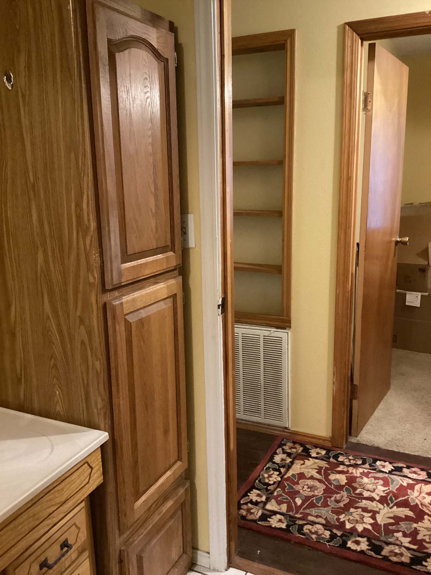 Oak storage cabinet for bathroom. Features multiple shelves and a drawer at the bottom. Approximate Dimensions: 75" H x 18" L x 18" W.