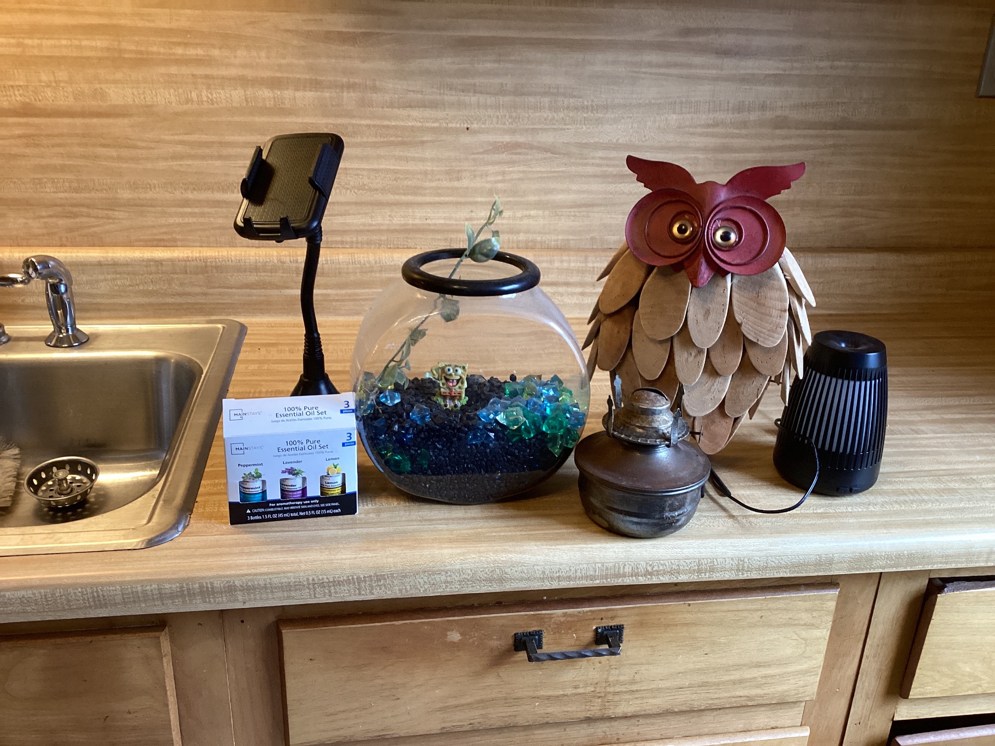 A collection of various home decor items, including a wooden owl figurine, a small terrarium with decorative stones and a small figurine, an electric oil diffuser, and a set of essential oils.