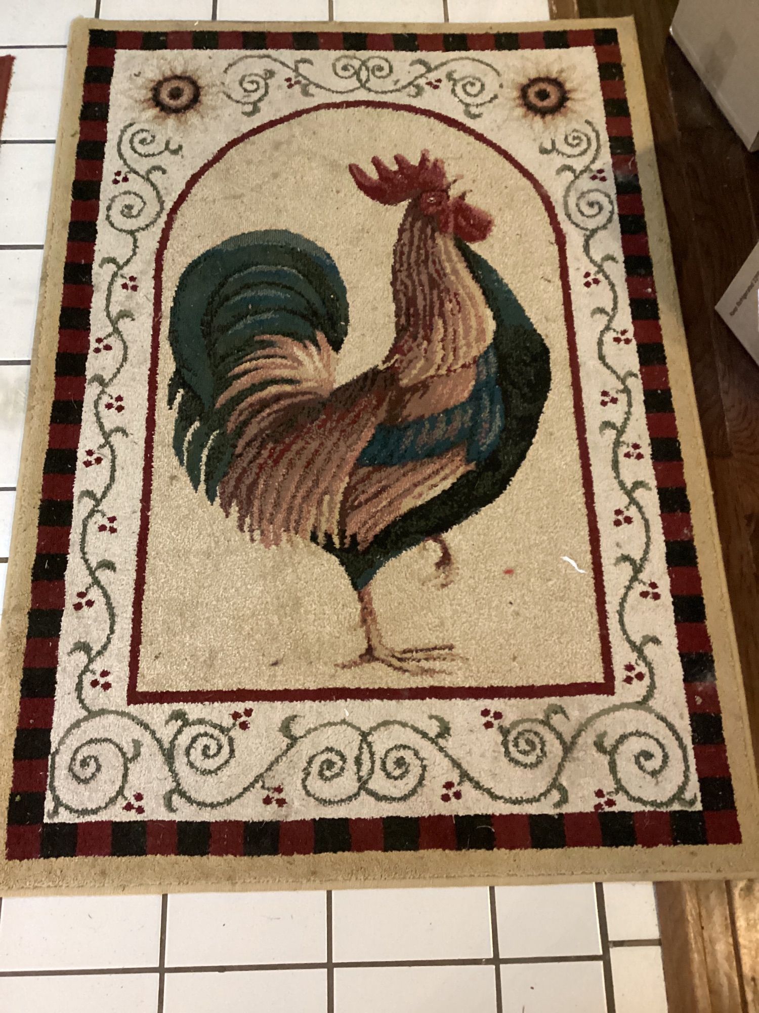 This is a decorative area rug with a central rooster design. The rooster is standing in a classical archway, framed by floral details and a checkered border.