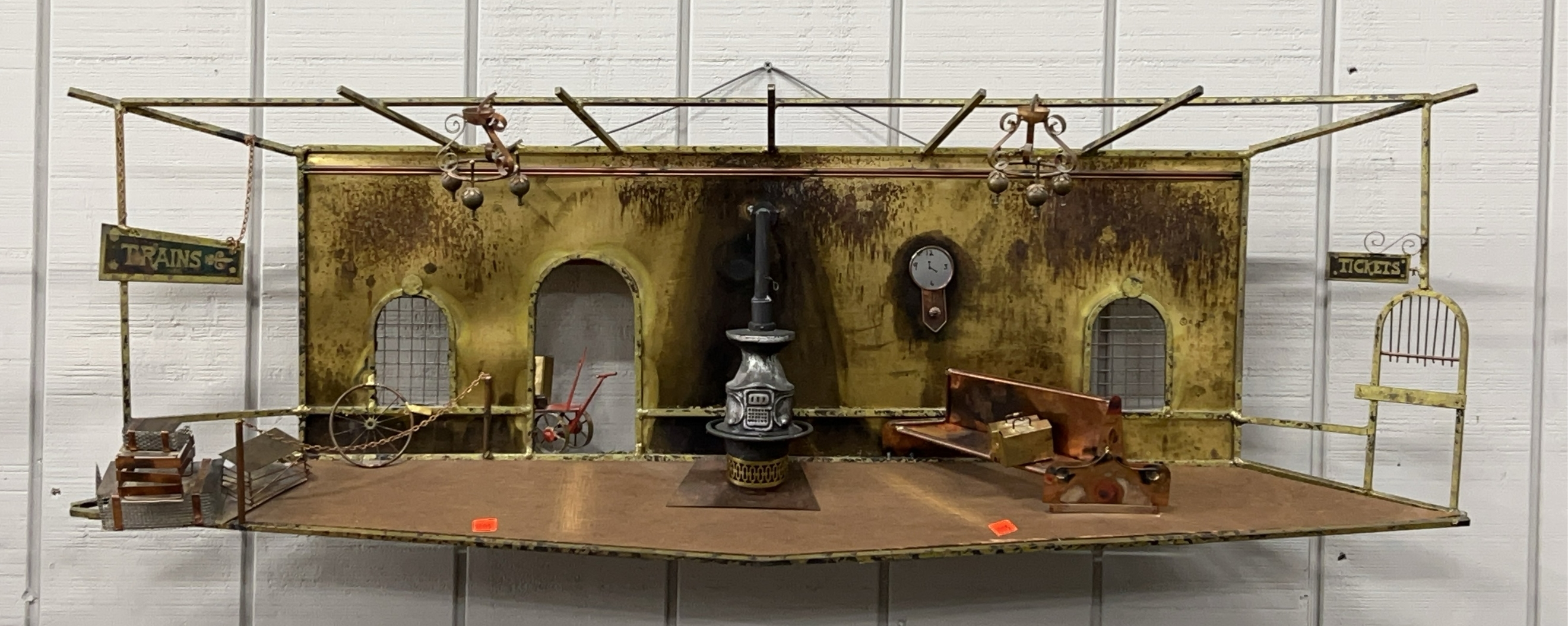 Signed Curtis Jere Copper Wall Art Interior Train Station, 49x16"