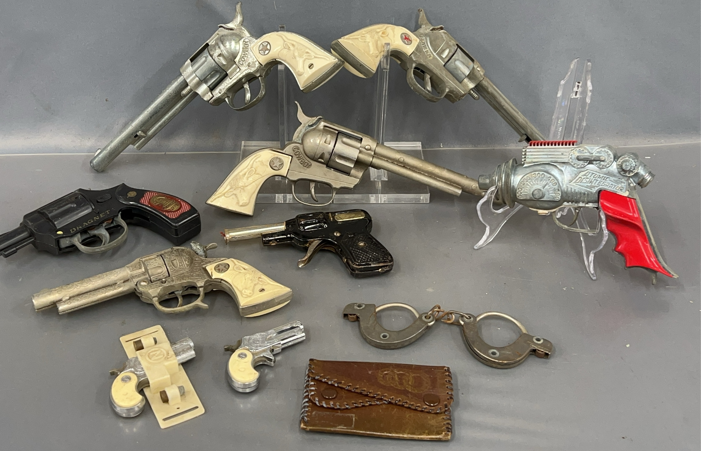 Vintage Toy Character Guns, Dragnet, Atomic Disintegrator, Air Pop, Hand Cuffs, And Other Toys Pistols