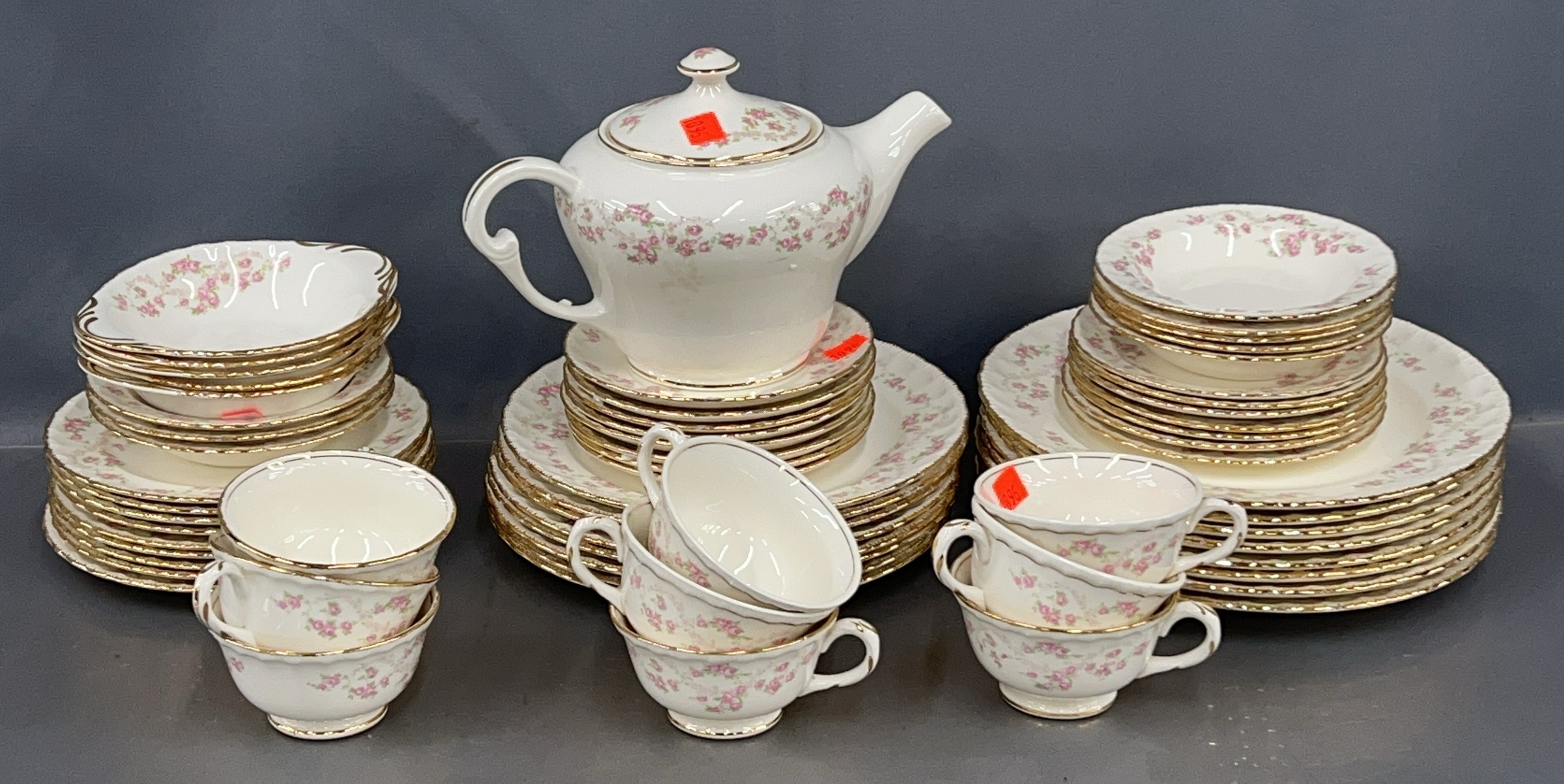 Pope Gosser Rose Pattern Dinner Ware, Tea Pot, Cups, Saucers, Lunch and Dinner Plate and Bowls, Some Wear to a Few Pieces