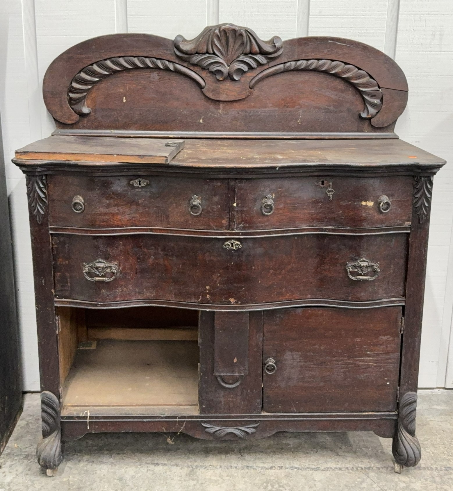 Antique Wooden Side Board With Carved Pediment, Does Have Age Wear and Lower Door Needs Repair, 47x23x50"