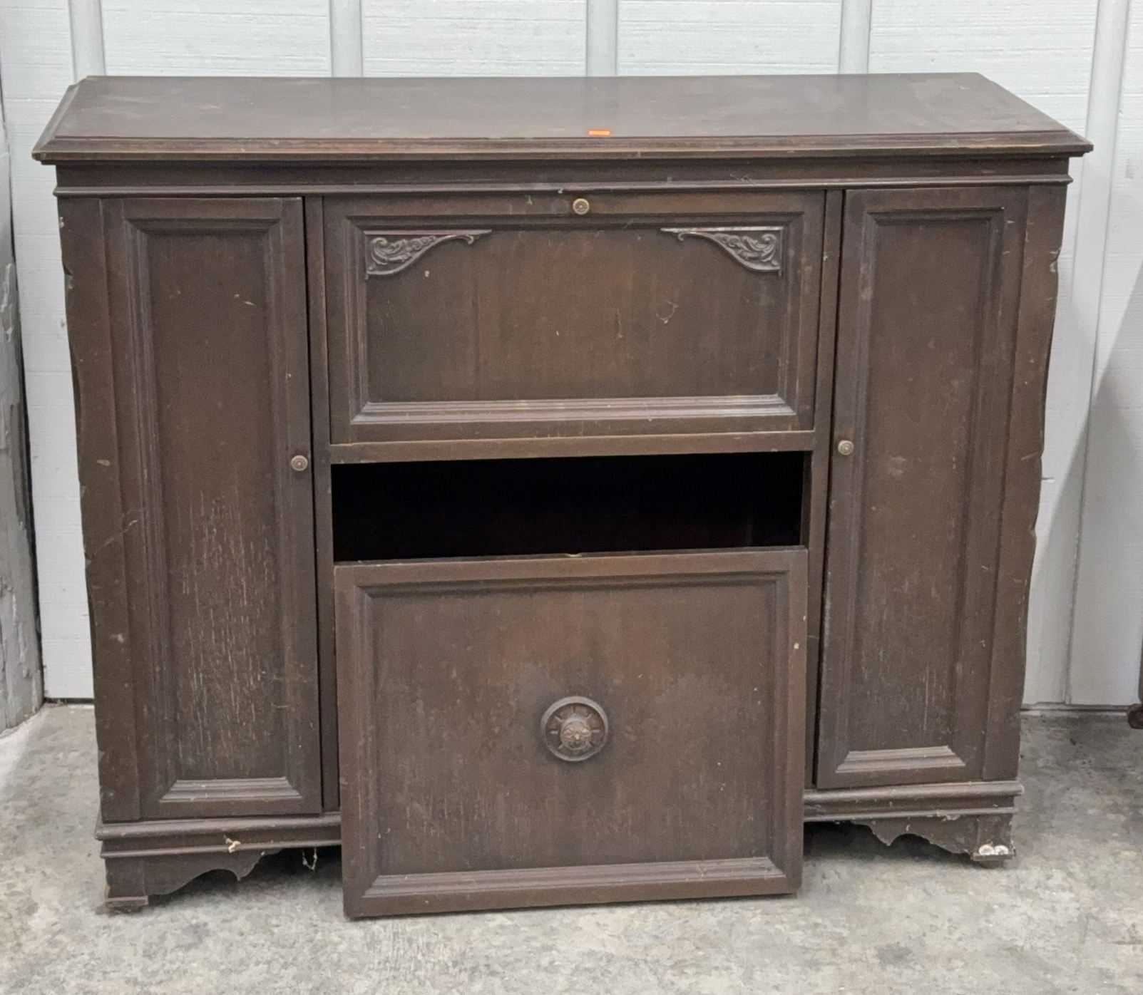 Vintage Stereo Console, Empty Cabinet Has Drop Front and Removable Doors, Sides Open Where Speakers Were, Has Wear and Needs Cleaned, Product Tag ZORK MFG. CO. and Measures 42x15x34"