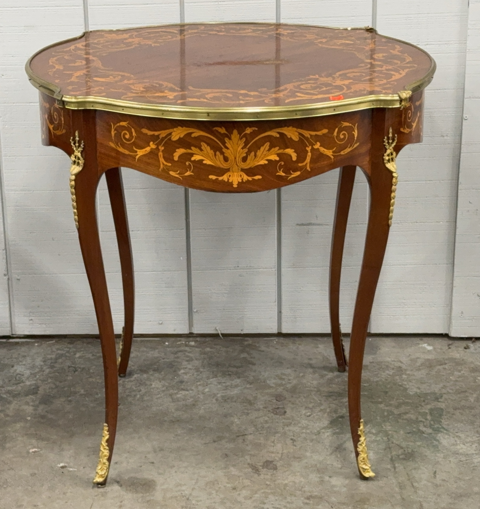 French Louis XV Style Mahogany and Marquetry Inlay Side Table, Some Wear In Two Places On Top Finish 29x29x29"