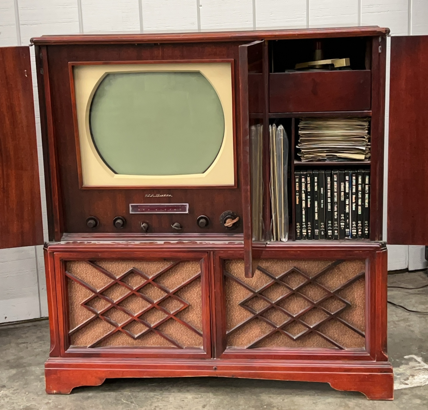 Victrola Vision Console Vintage Television in Cabinet Does Power On and Sound However Turntables Not Turning, Knobs All Move Does Have Records, Overall 36x23x39"