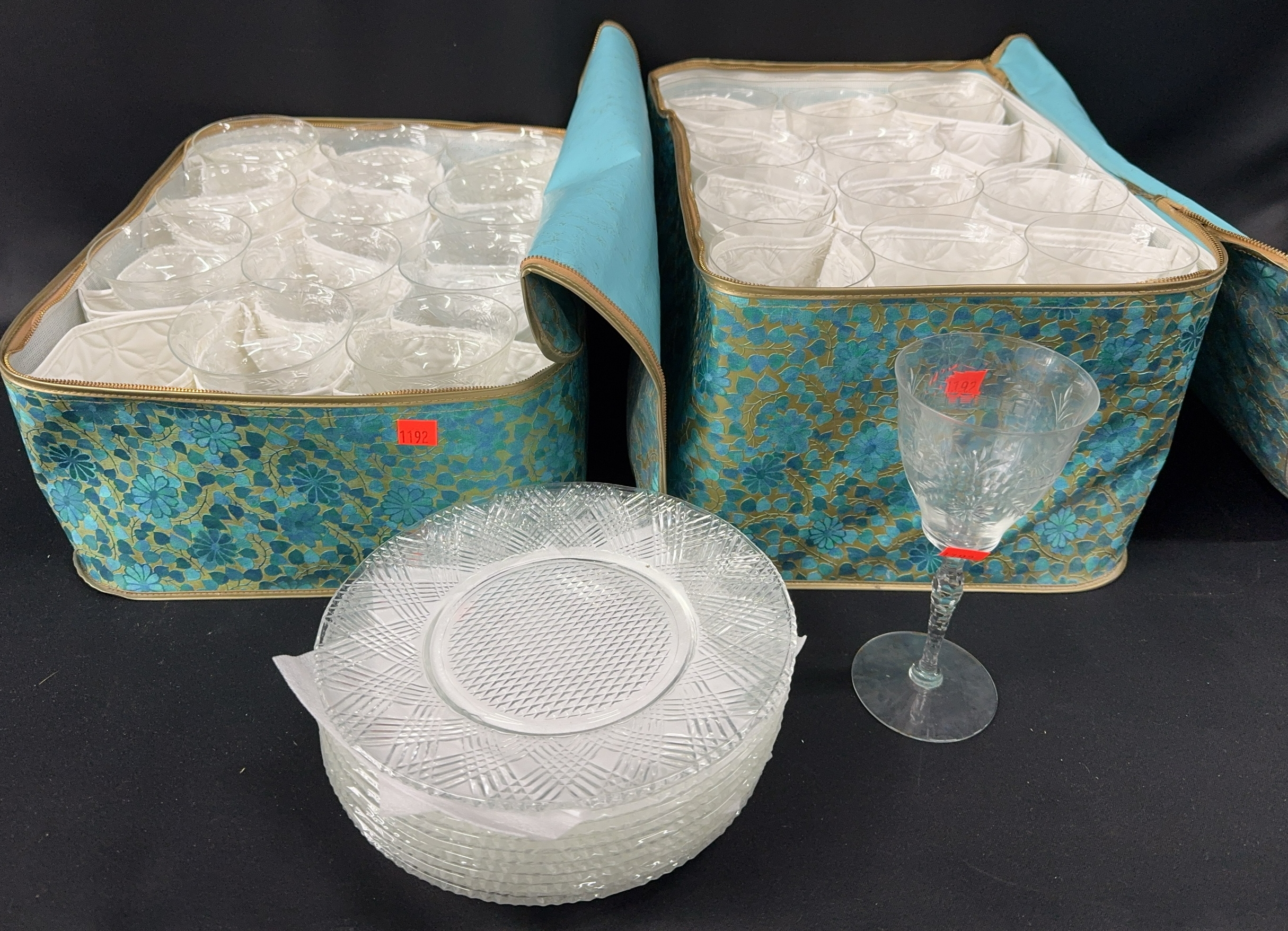Vintage Etched Stems Basket Weave and Floral Pattern, Some Slight Chips on Bases, Matching Champagnes, Clear Snack Plates, Largest 8.5", Tallest Stem 7.5" In Zippered Cases