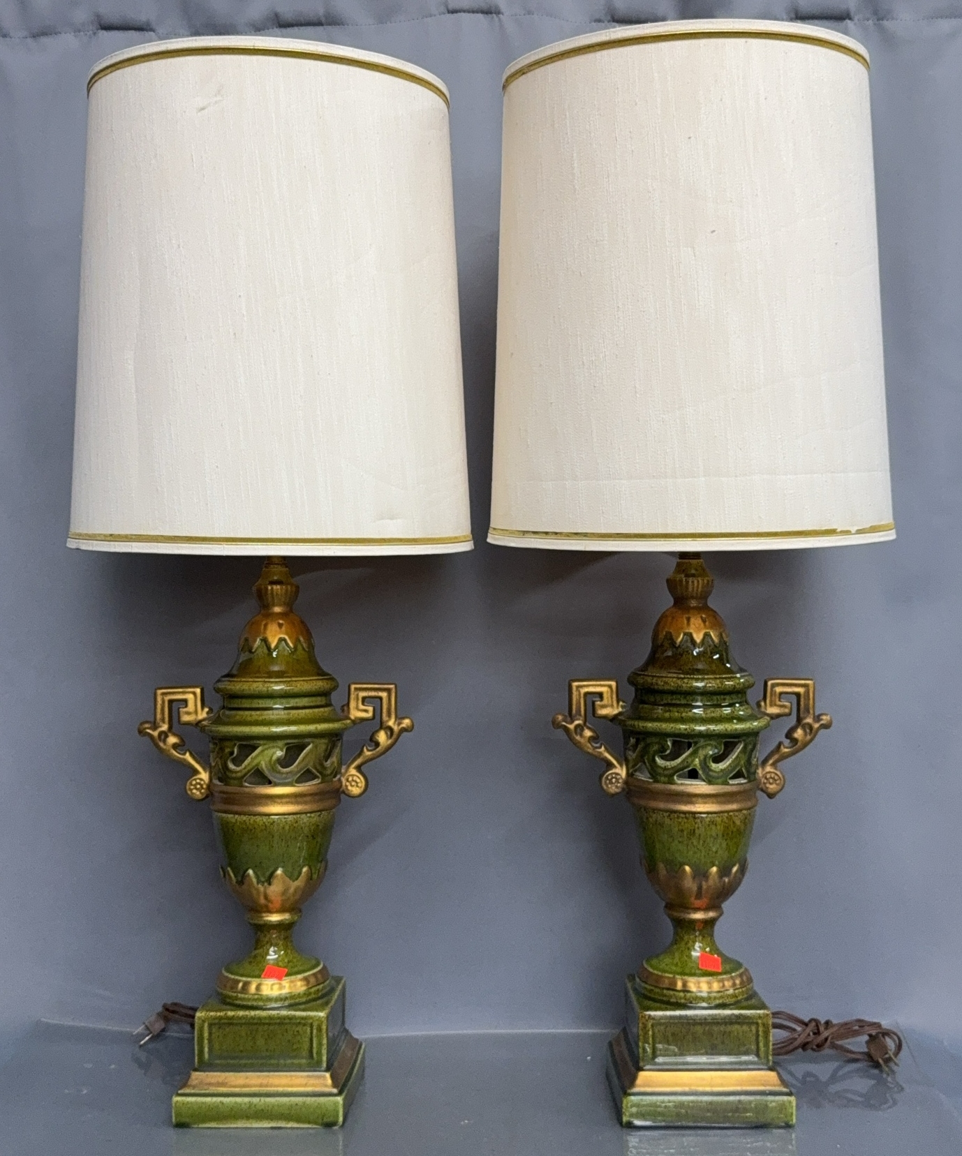 Pair of Ceramic Green and Gold Urn Style Table Lamps 37.5"
