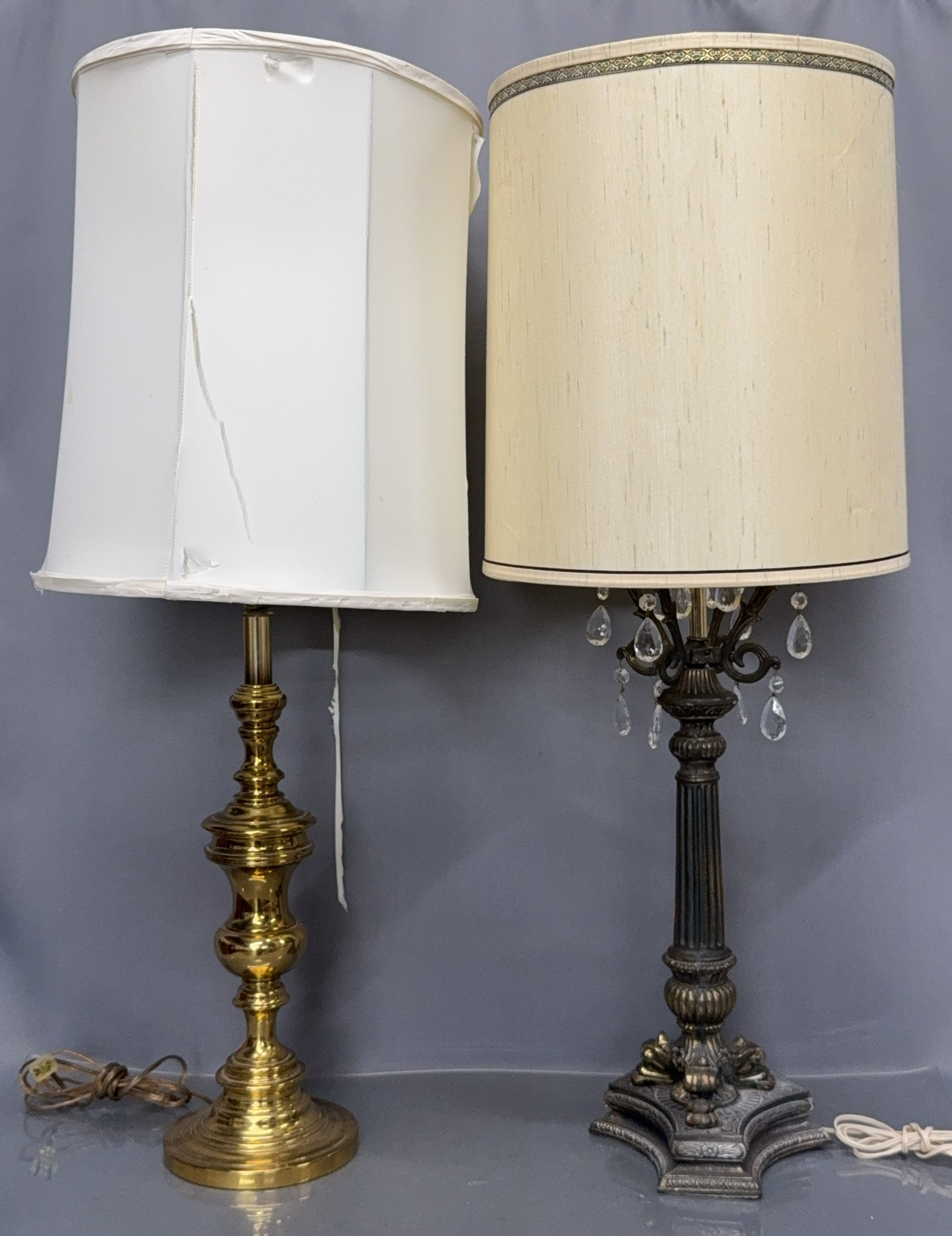 2 Table Lamps, Brass Base, and Prisms, Both 36" With Shades