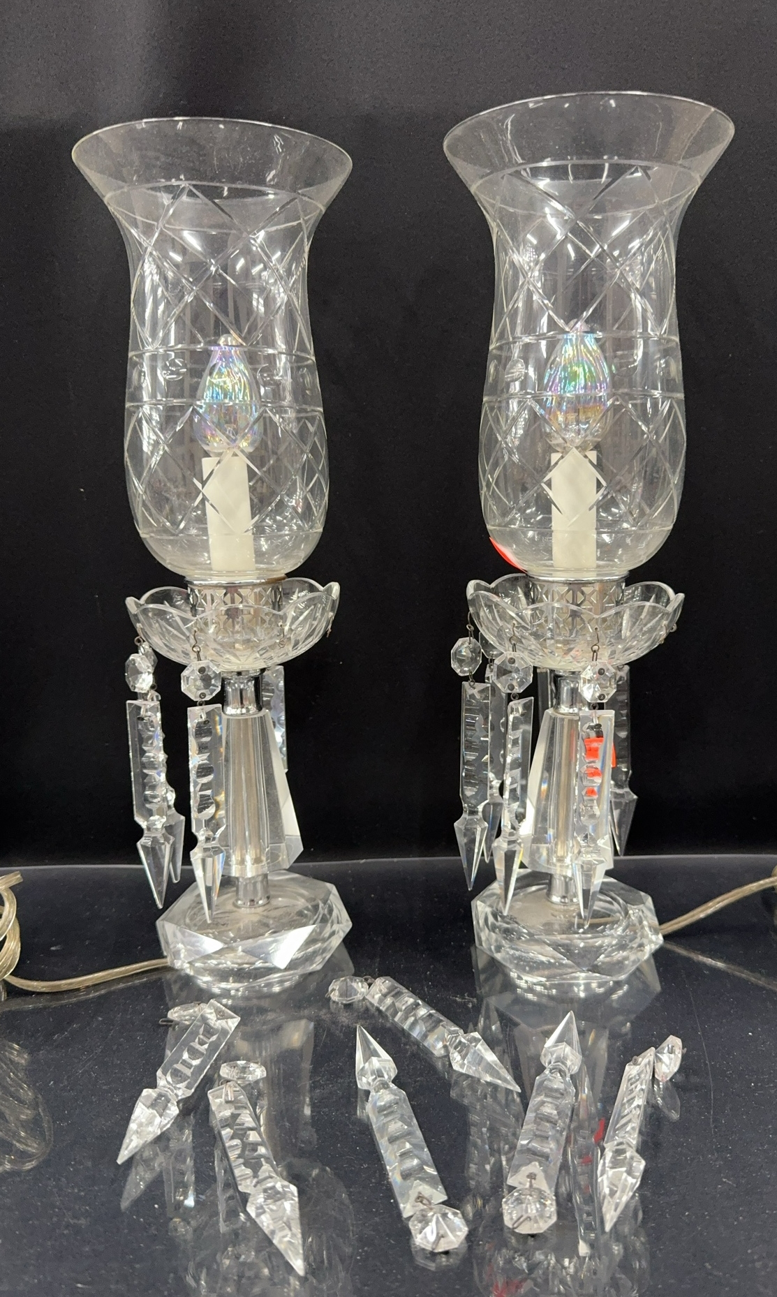 Crystal and Glass Prism Candle Stick Style Table Lamps With Glass Etched Shades, Overall Height 15"
