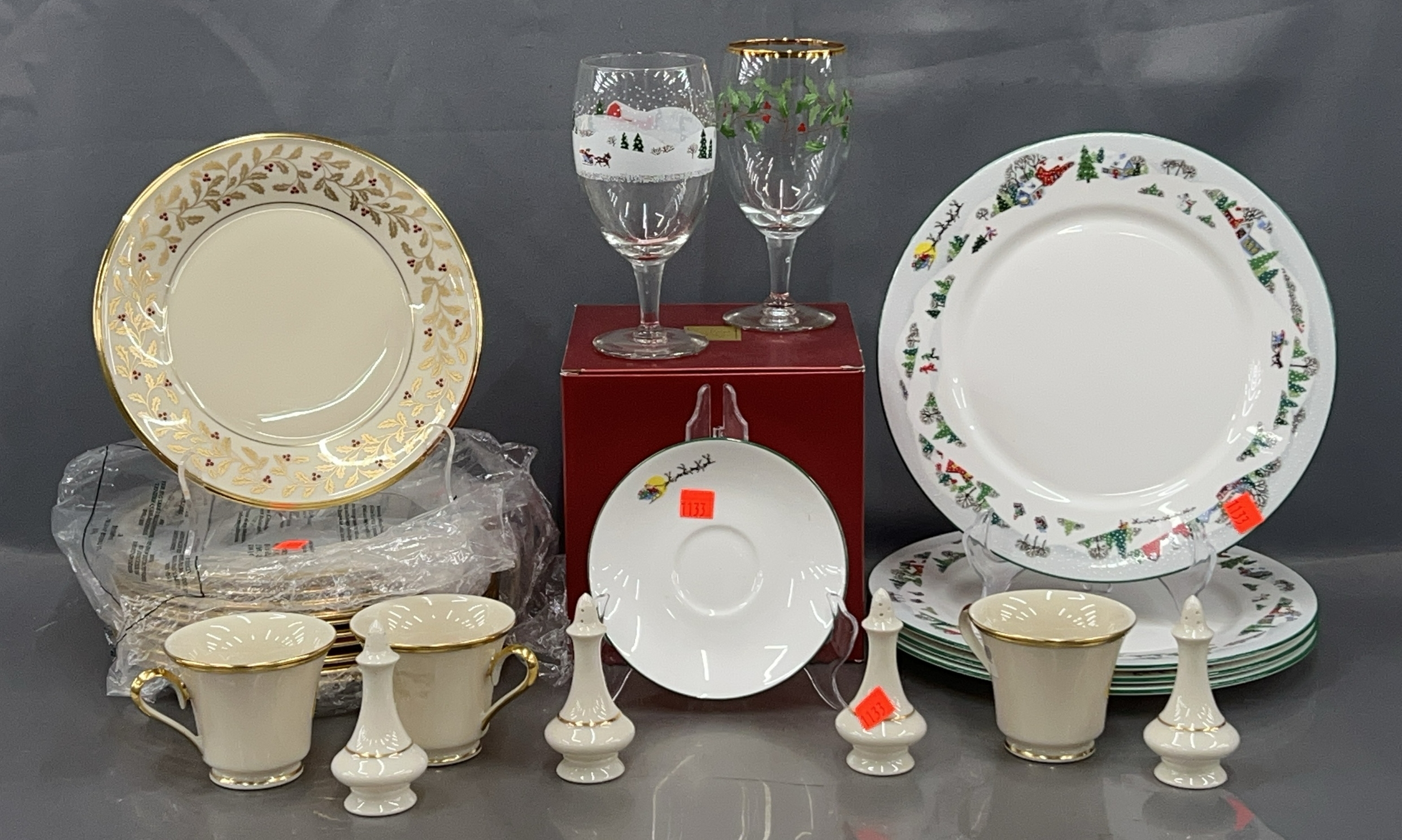 Lenox Variety of Dishes, Goblets, Salt and Peppers, Holiday Sleighride Plates Largest 11" , 1 Saucer, 3 Cups, Eternal Christmas Pattern Plates